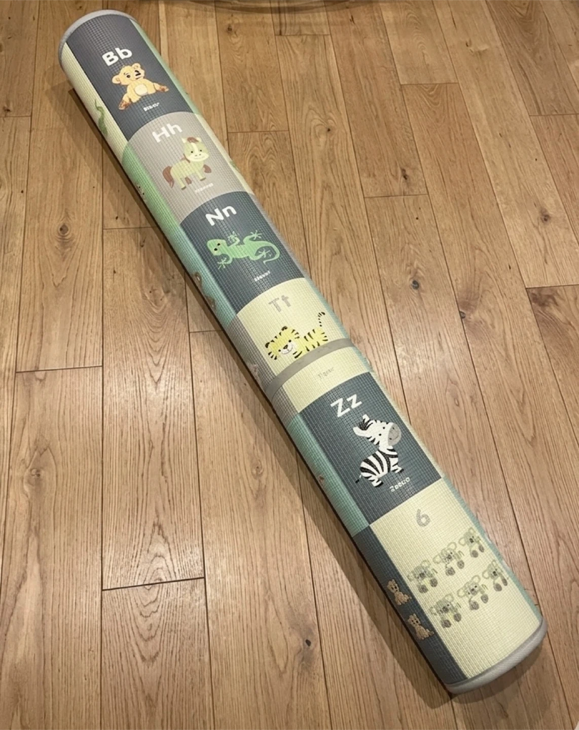 This play mat features the alphabet with animal illustrations, perfect for tummy time or learning. It's made of a soft, cushioned material for comfort. Ideal for little ones exploring letters and animals!
