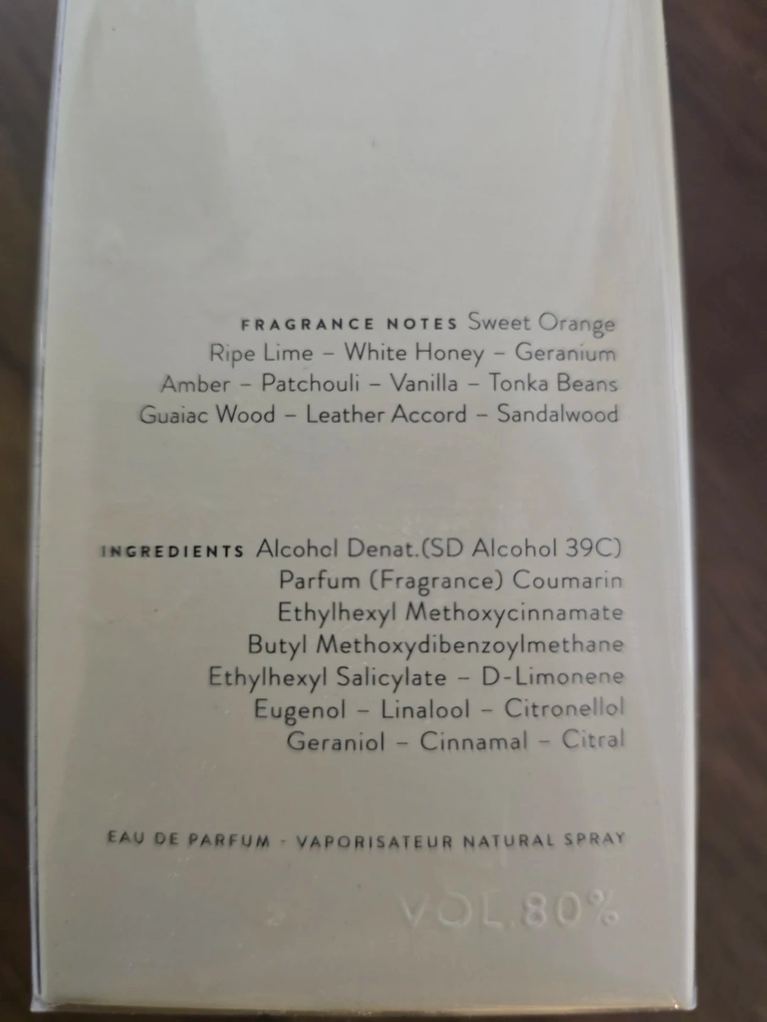 Fragrance notes include Sweet Orange, Ripe Lime, White Honey, Geranium, Amber, Patchouli, Vanilla, Tonka Beans, Guaiac Wood, Leather Accord, and Sandalwood. It's a vaporisateur natural spray.