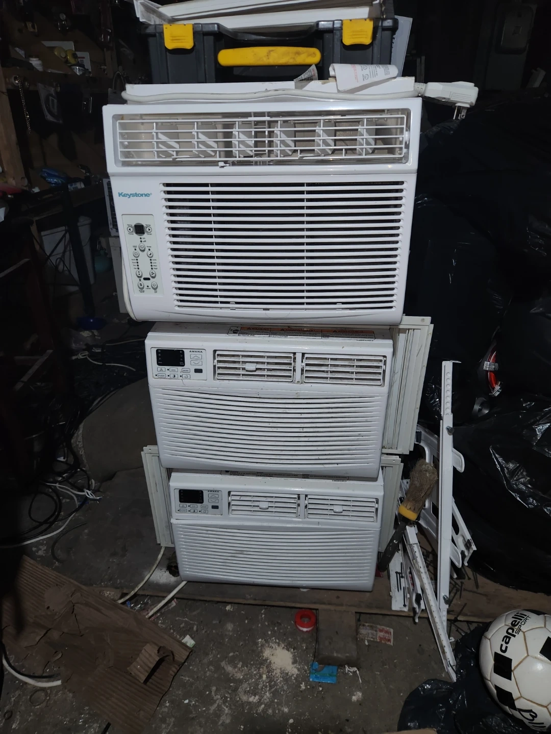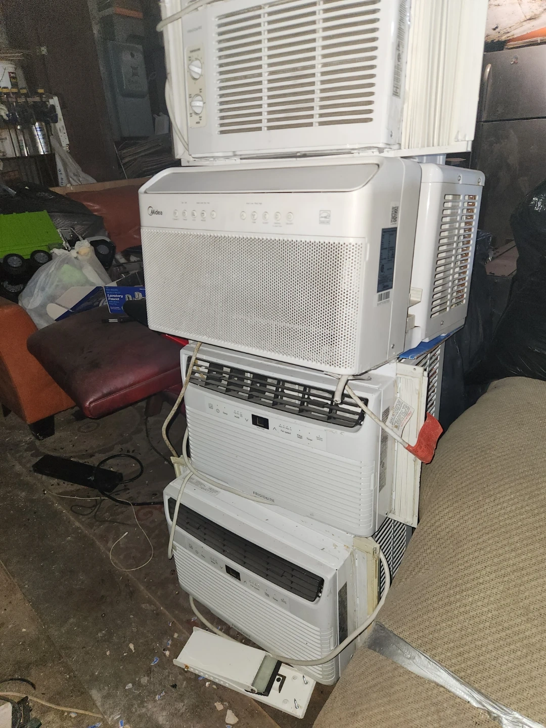 This listing includes a Keystone window air conditioner, a Midea window air conditioner, and a Frigidaire window air conditioner. All units appear to be white. They are all designed for window installation.