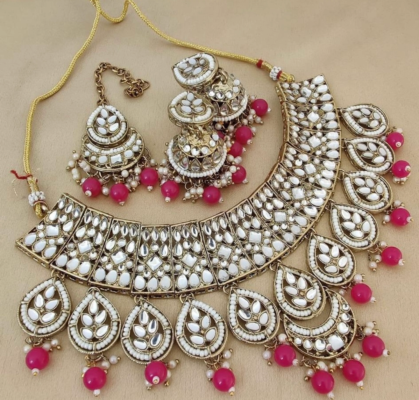 A beautiful necklace set. Features a necklace, matching earrings, and a headpiece. Delicate white accents. Pink beaded accents. Great to wear when you want to feel glamorous.