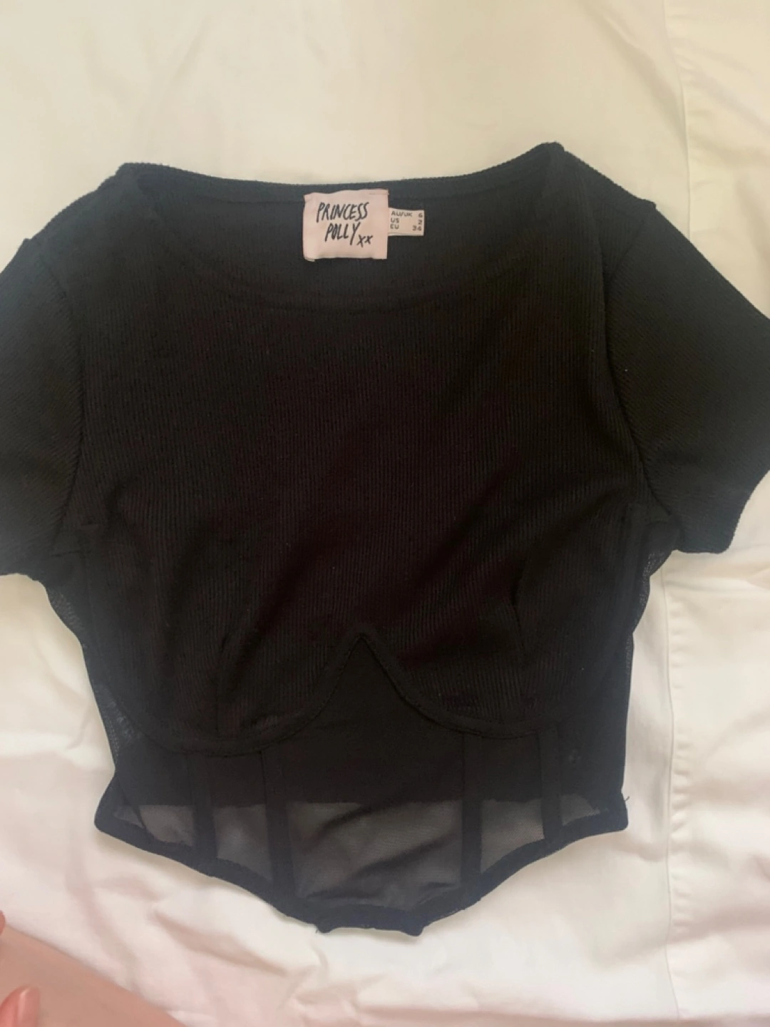 Selling a Princess Polly black top in size small It features a unique design with a ribbed texture and a sheer panel. Perfect for adding a stylish touch to your wardrobe!