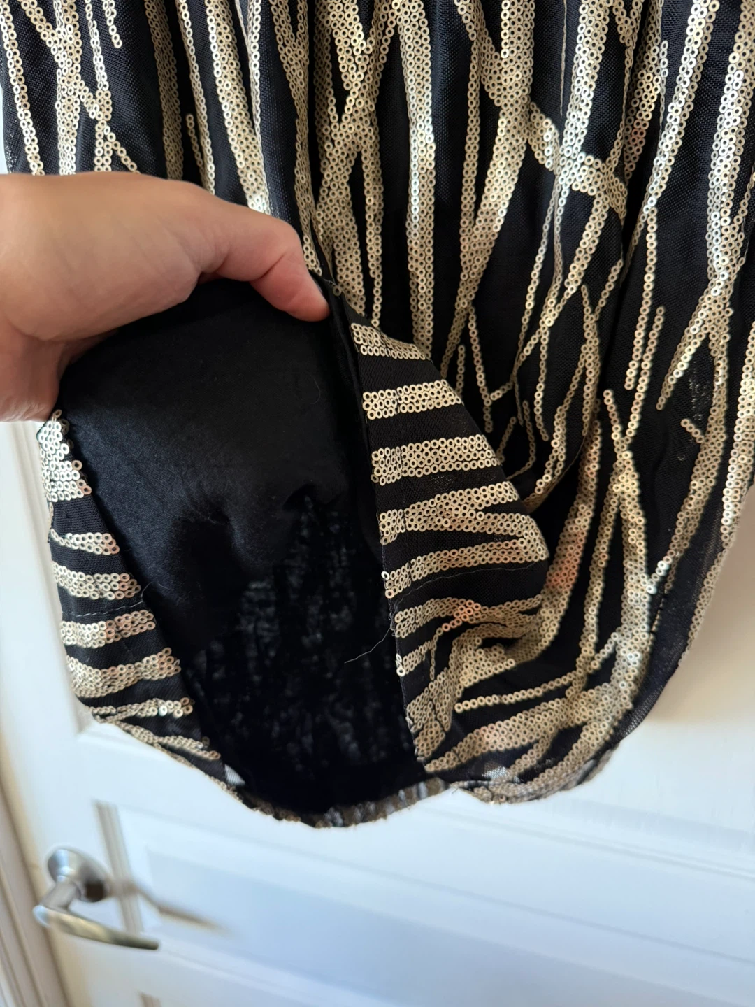 It features a black top and a gold and black patterned bottom.