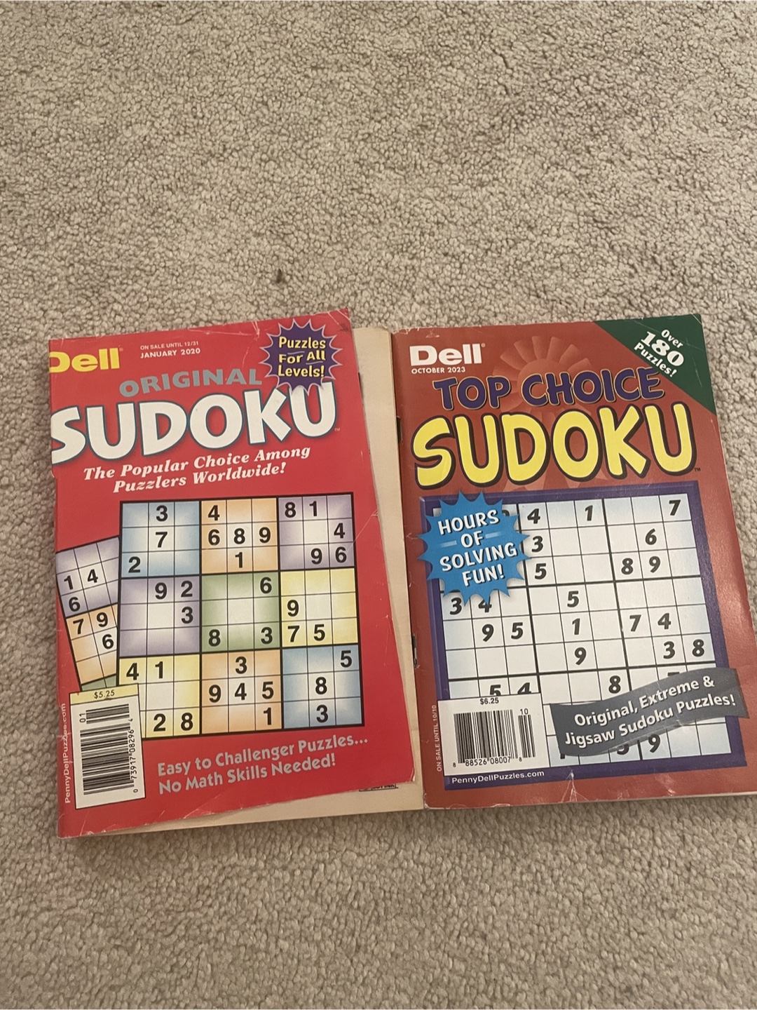 Two Dell Sudoku puzzle books for all levels! One is "Original Sudoku" and the other is "Top Choice Sudoku". Both have over 180 puzzles!