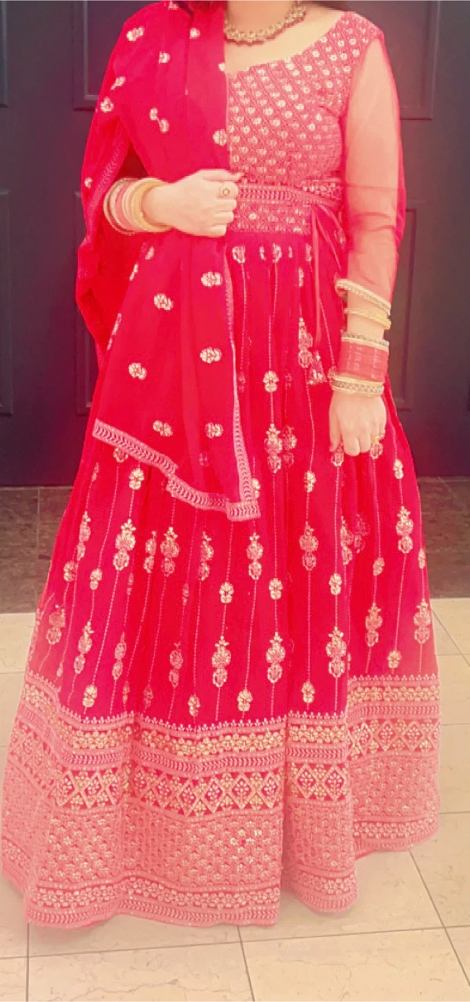 Beautiful red embroidered lehenga choli set with a matching dupatta. It features intricate gold thread work and bead embellishments throughout the skirt and bodice. The sheer dupatta has a decorative border. Fabric is lightweight and flowing. Can be negotiate