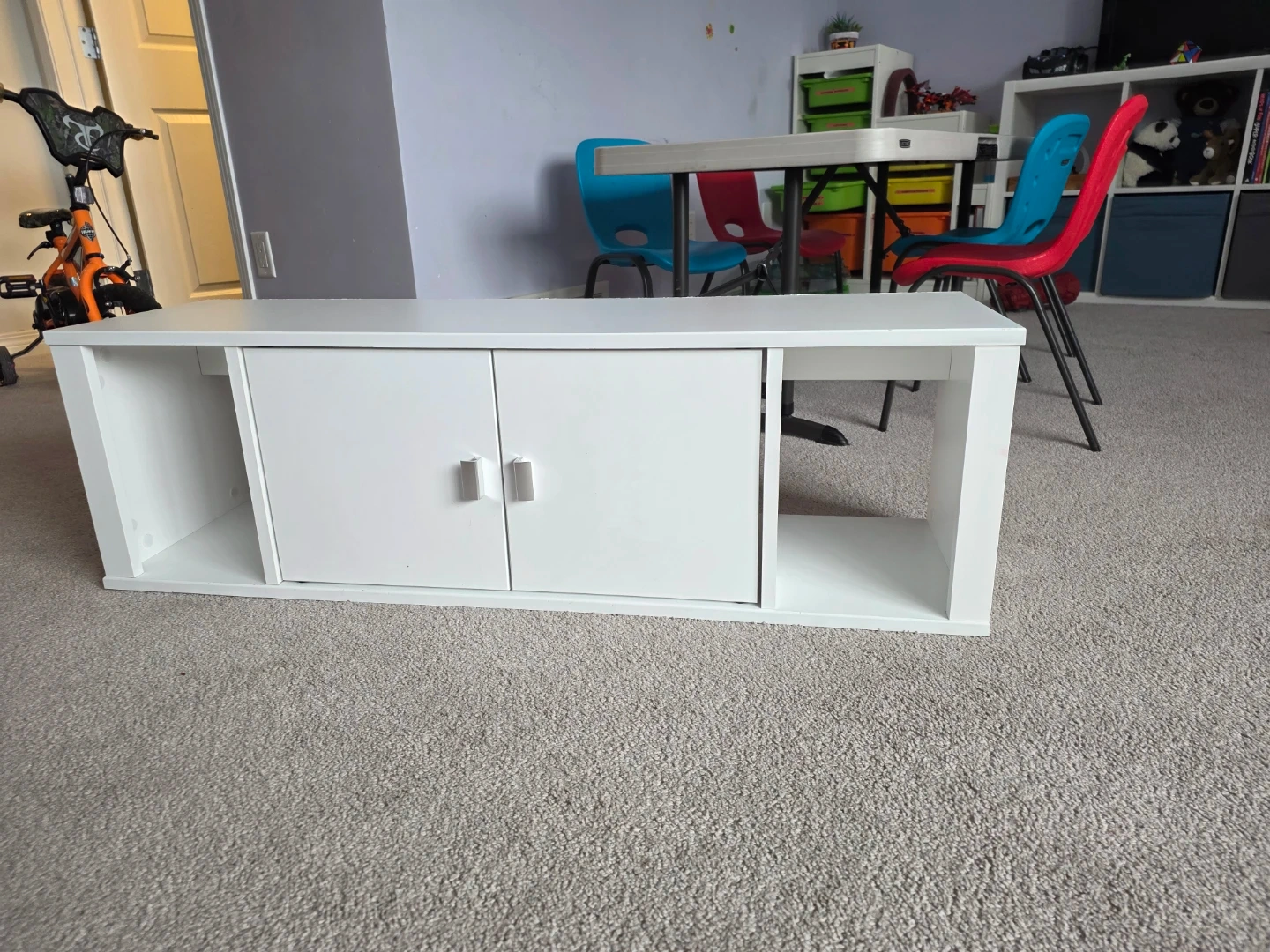 White media console with cabinet doors