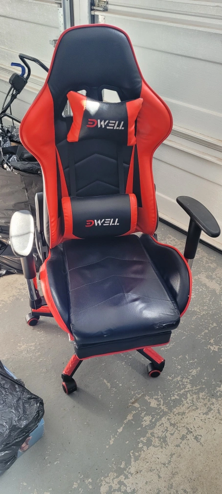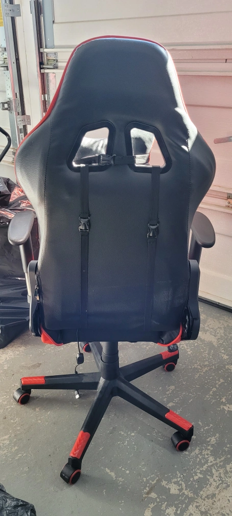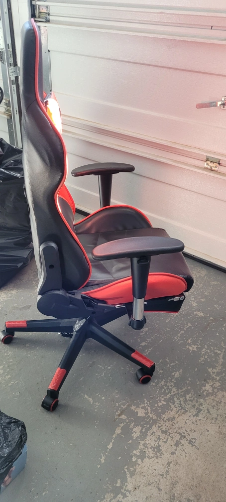 Comfortable gaming chair. Red and black colour scheme. Features adjustable armrests and lumbar support. Wheels for easy mobility. Good condition asking for $200