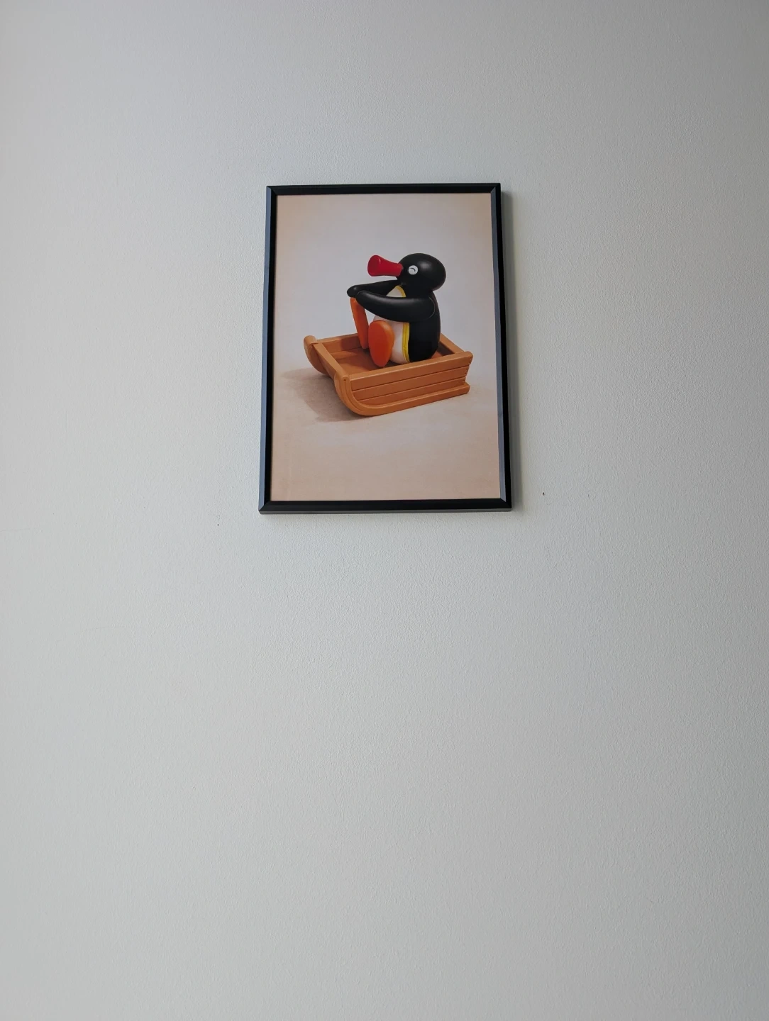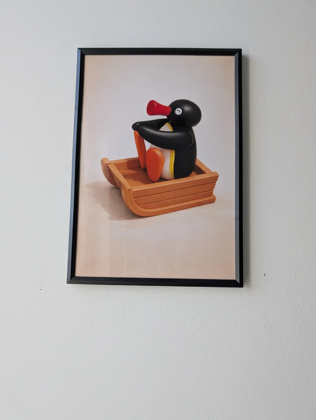 This framed print features the beloved character Pingu riding in a sled. It's a fun piece of art for any fan's collection. The print is housed in a black frame.