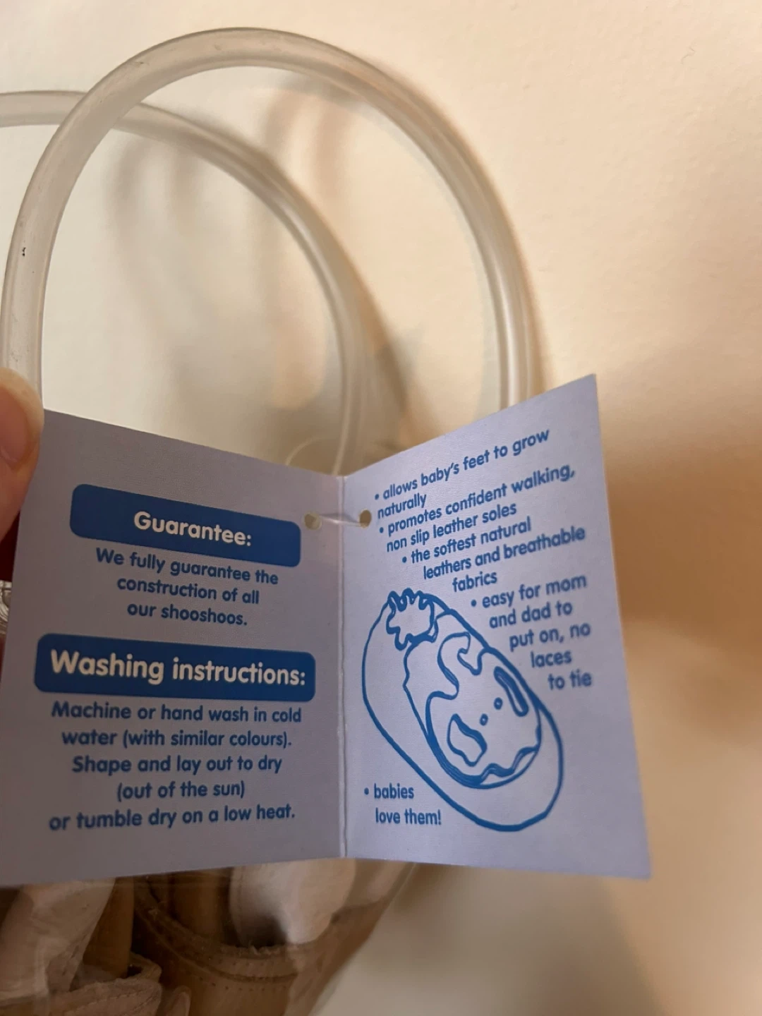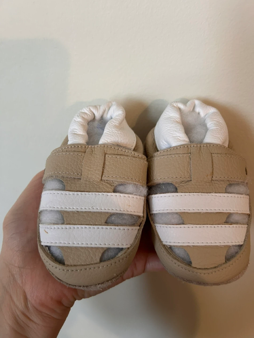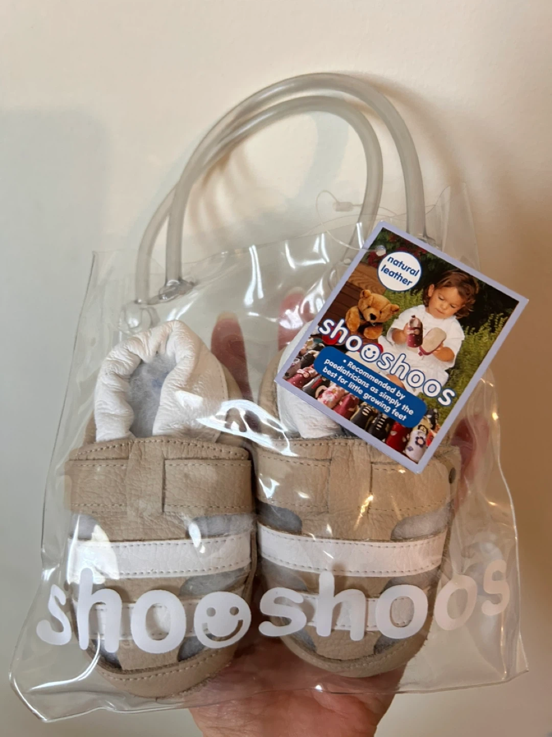These Shooshoos sandals are made from soft, natural leather. They feature non-slip soles to promote confident walking. They're easy for parents to put on and take off, with no laces to tie. Babies love them!