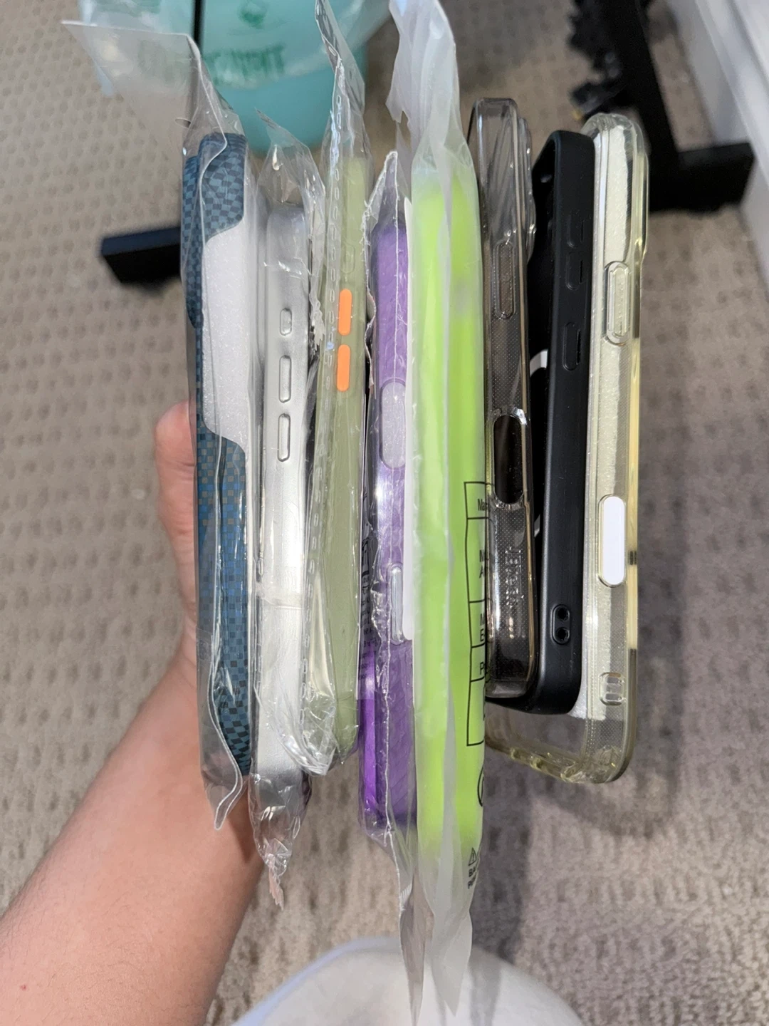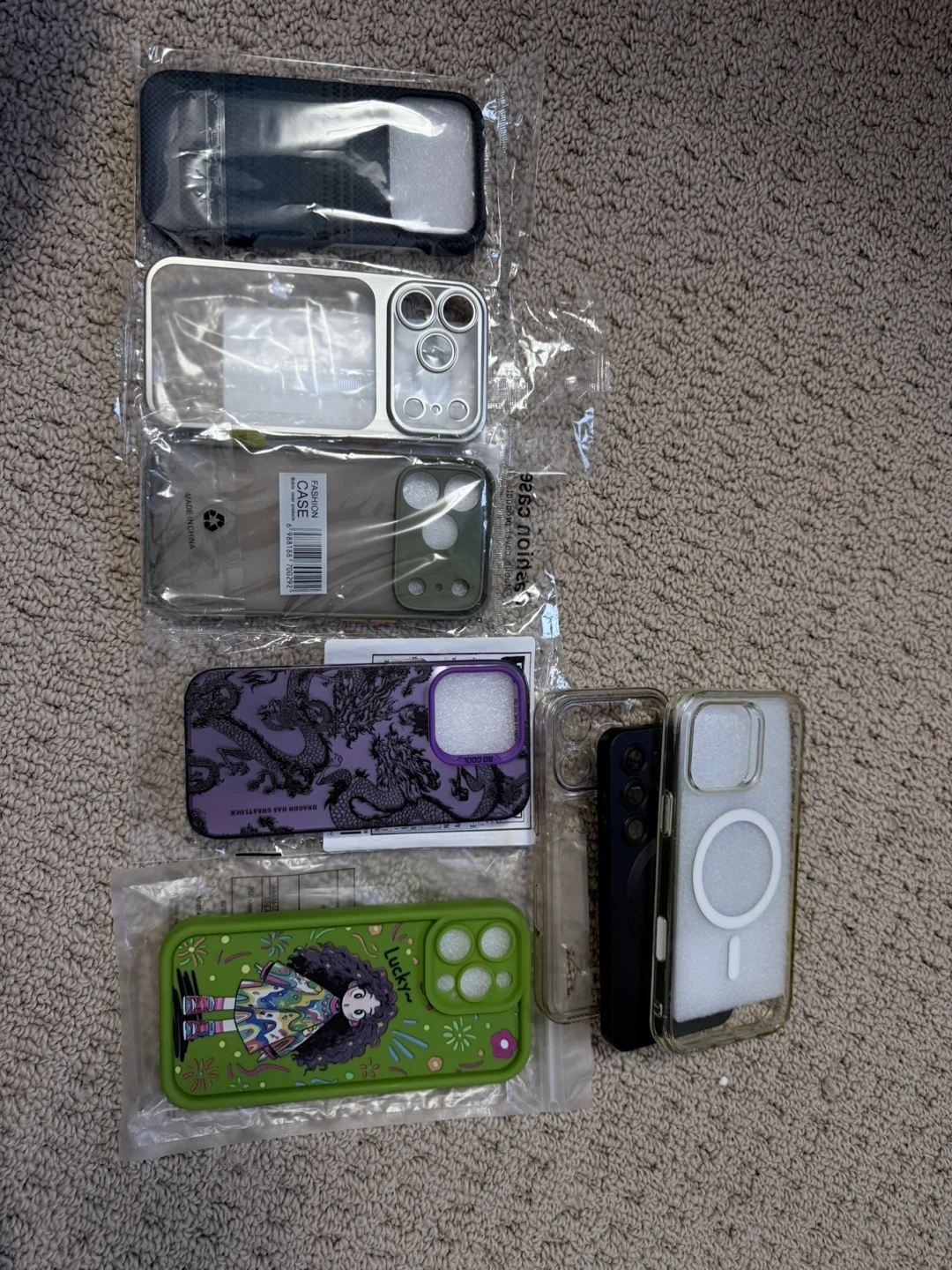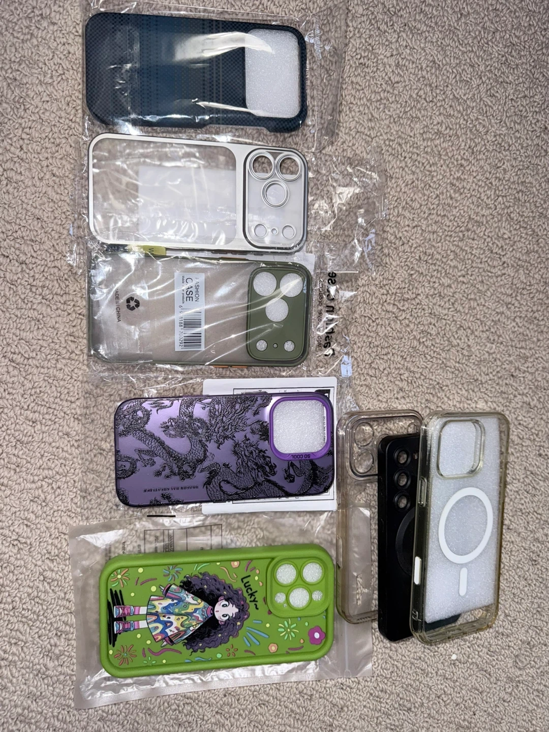 Bundle of six phone cases in various styles and colours. Includes clear cases, a green case with a character design, a purple dragon case, and patterned cases. These are for different phone models.