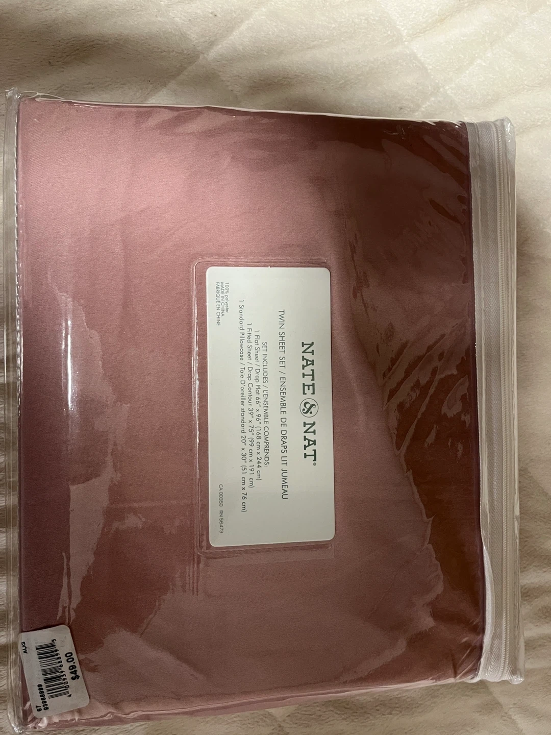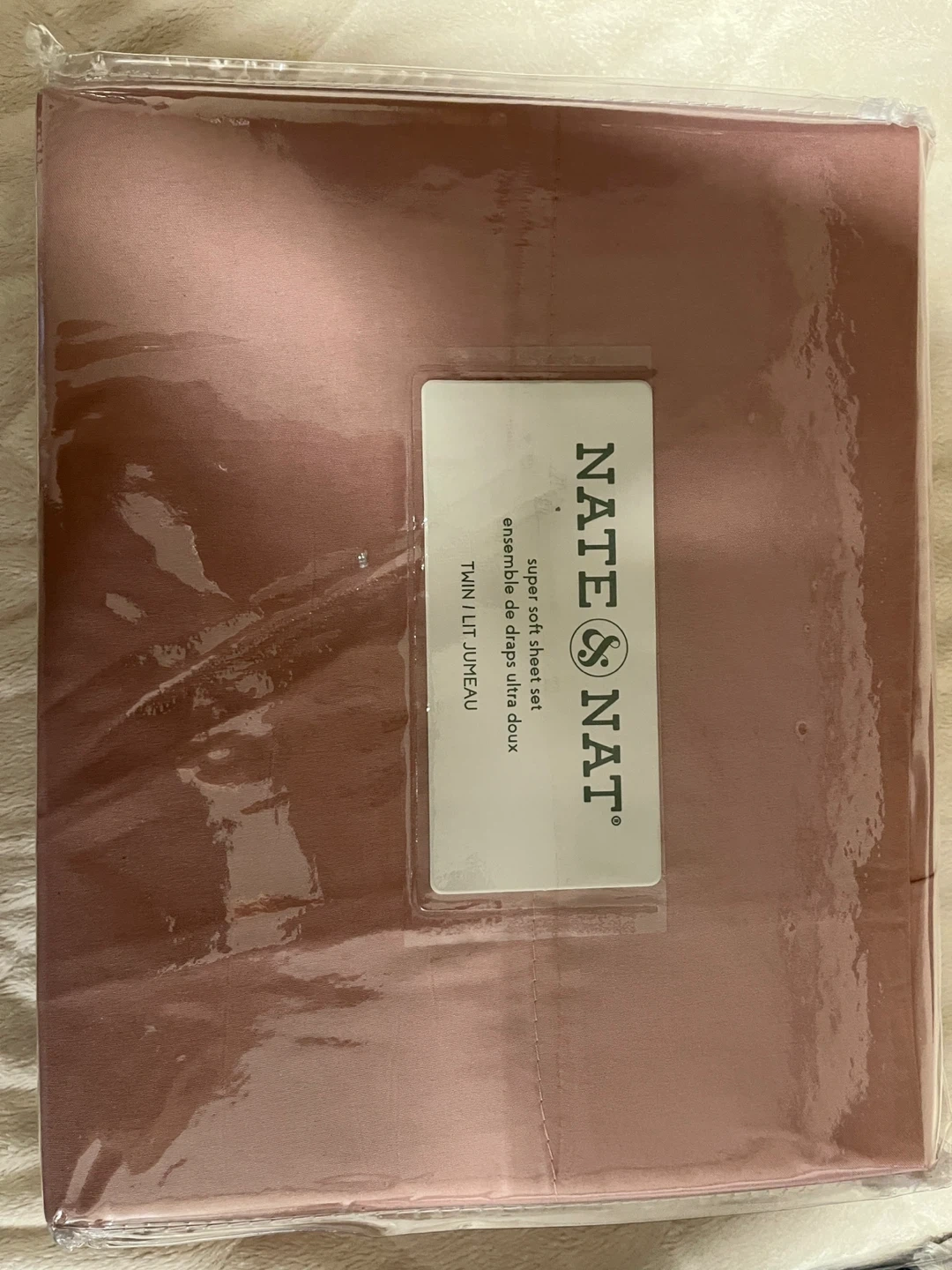 This is a Nate & Nat super soft sheet set in a twin size. It includes one flat sheet and one pillowcase. The set is made from a blend of polyester and rayon for a super soft feel. This set is great for adding a touch of comfort and style to any bedroom!