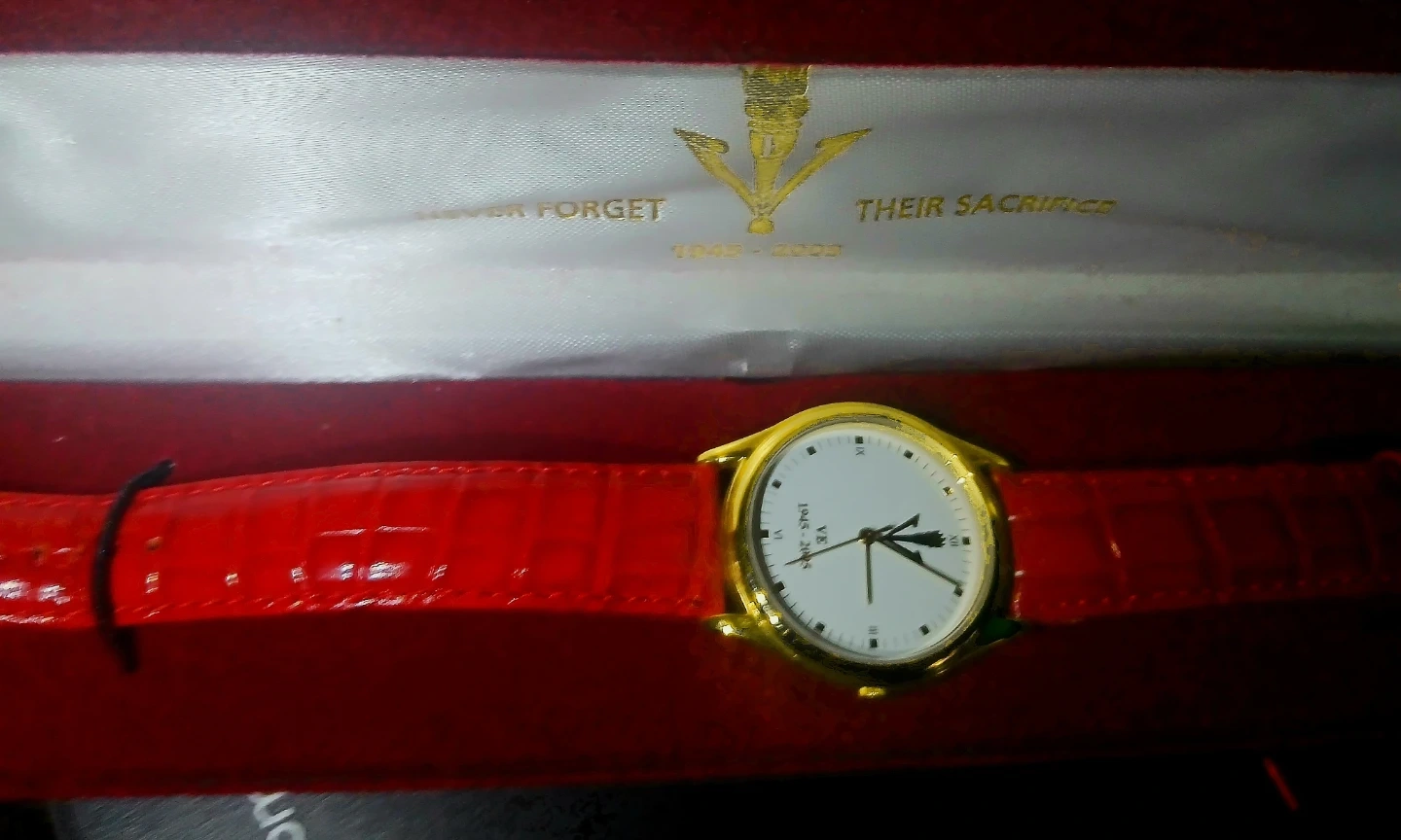 This gold-plated watch commemorates VE Day 1945-2005 with raised markings and a Canadian poppy emblem engraved on the caseback. It includes the words 'Never Forget' and 'Their Sacrifice'. The watch comes in a red presentation box with a matching red band. It serves as a keepsake memento recognizing Canada's role and sacrifice during WWII.