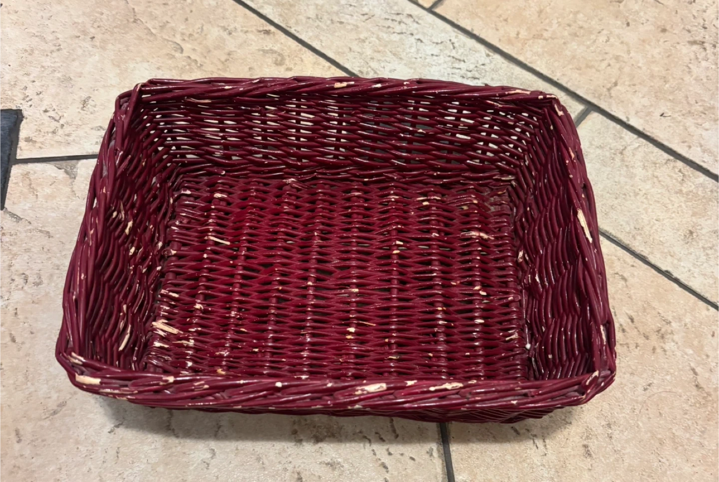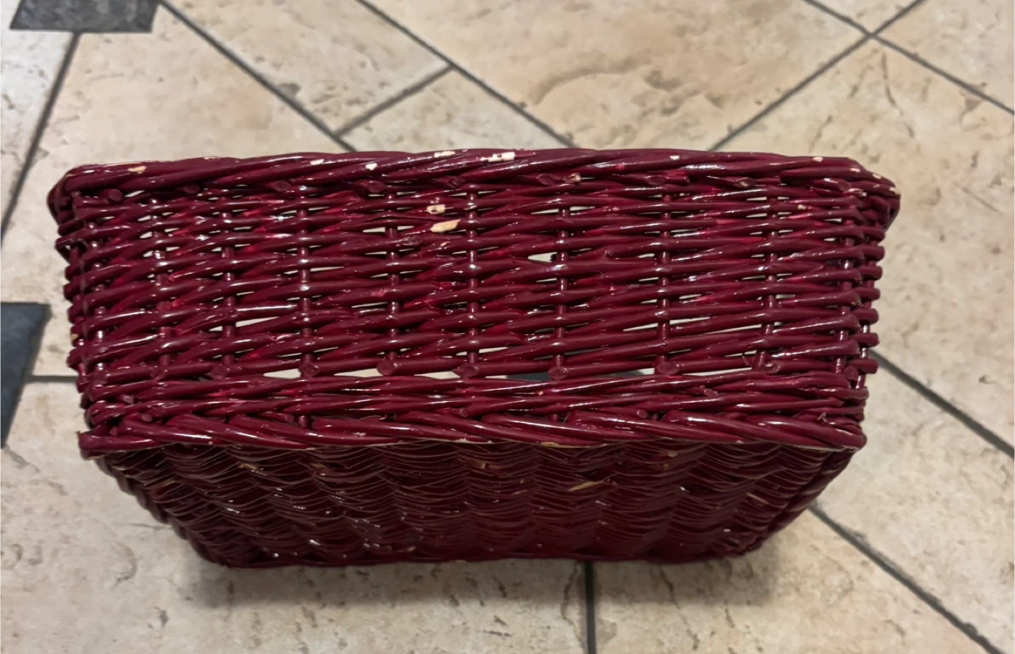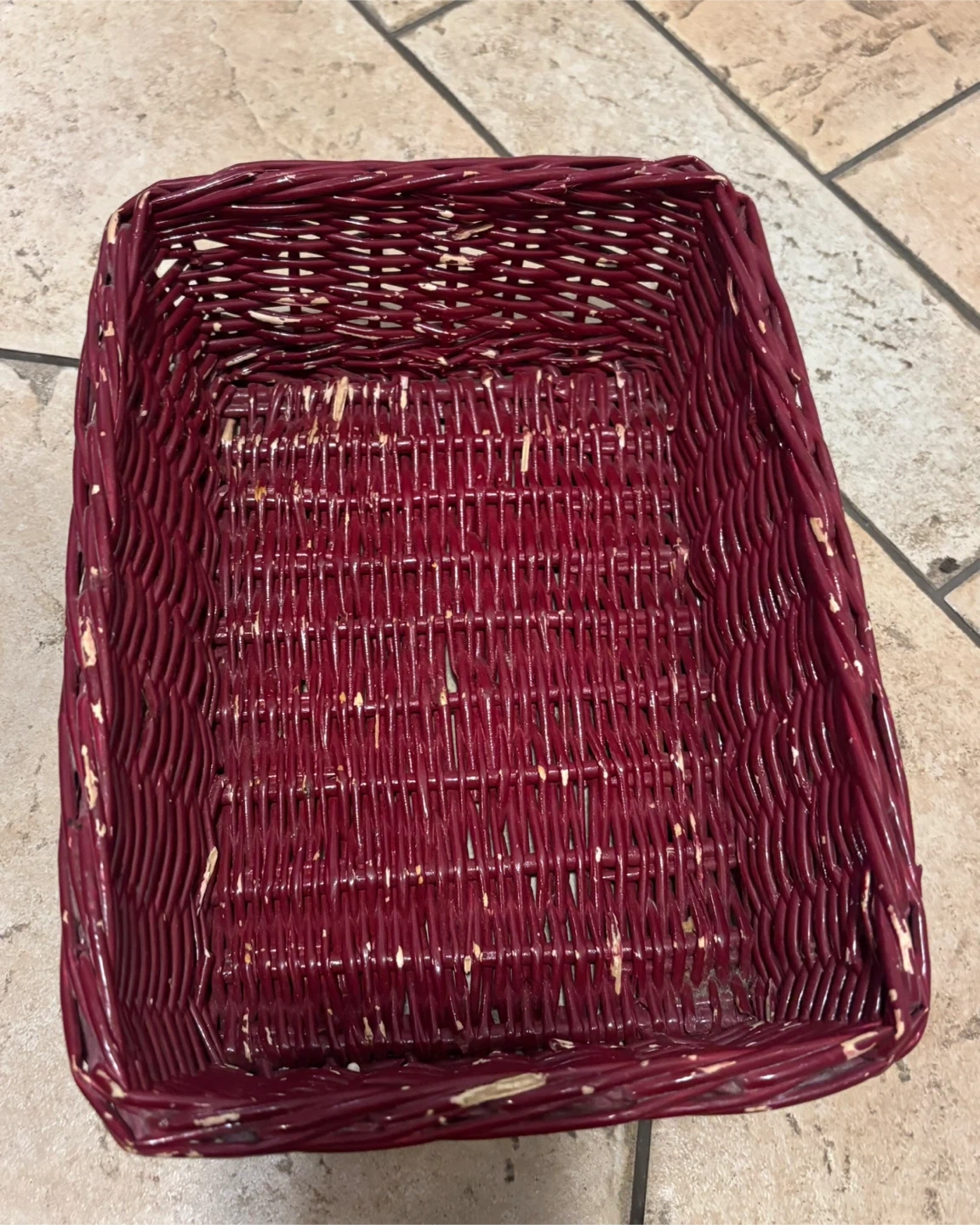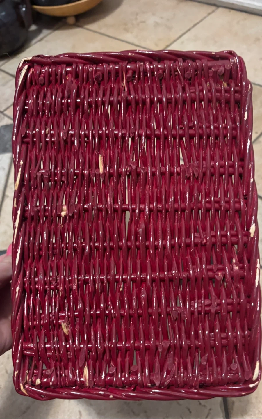 It's a red wicker basket, great for storage or decor. Woven design with a bit of wear on the paint. Perfect for organizing small items on a shelf or counter!