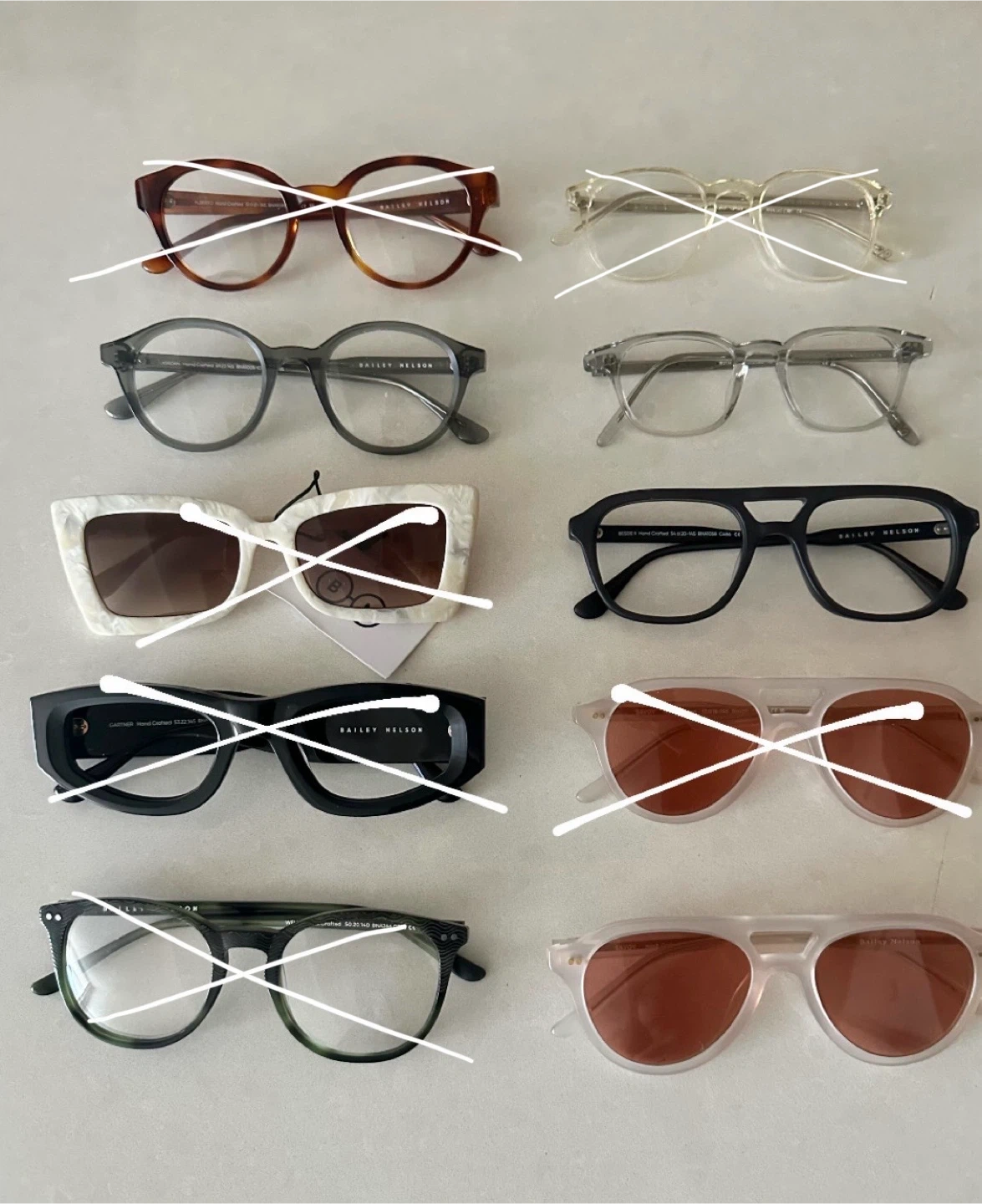 Selection of Bailey Nelson eyeglasses and sunglasses. Includes various styles and colours in acetate and plastic frames. Some with tinted lenses.