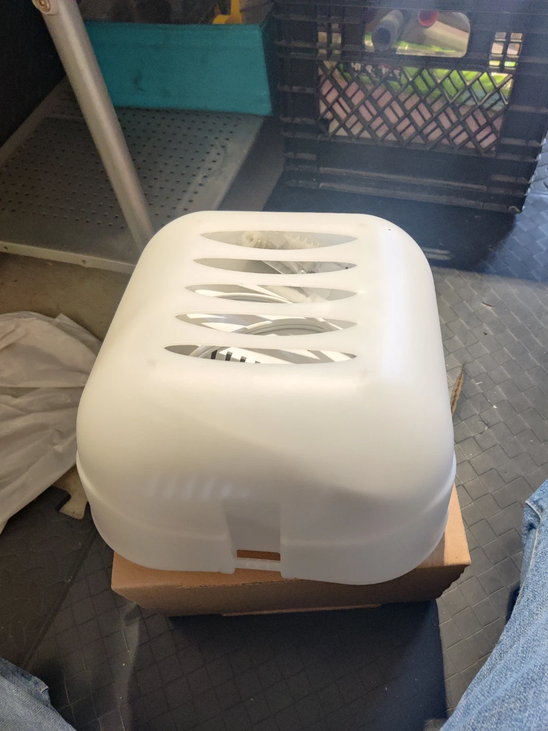 This is a LiftMaster light fixture for a garage door opener. It has two sockets for light bulbs. The unit includes the plastic cover. It's made of plastic.