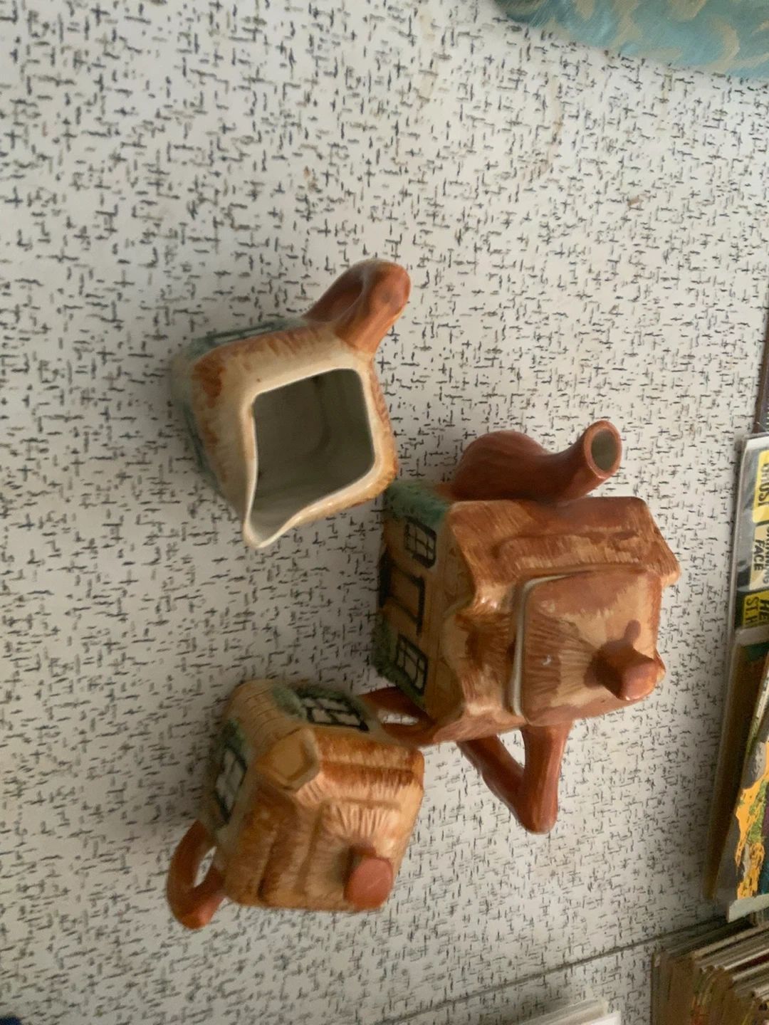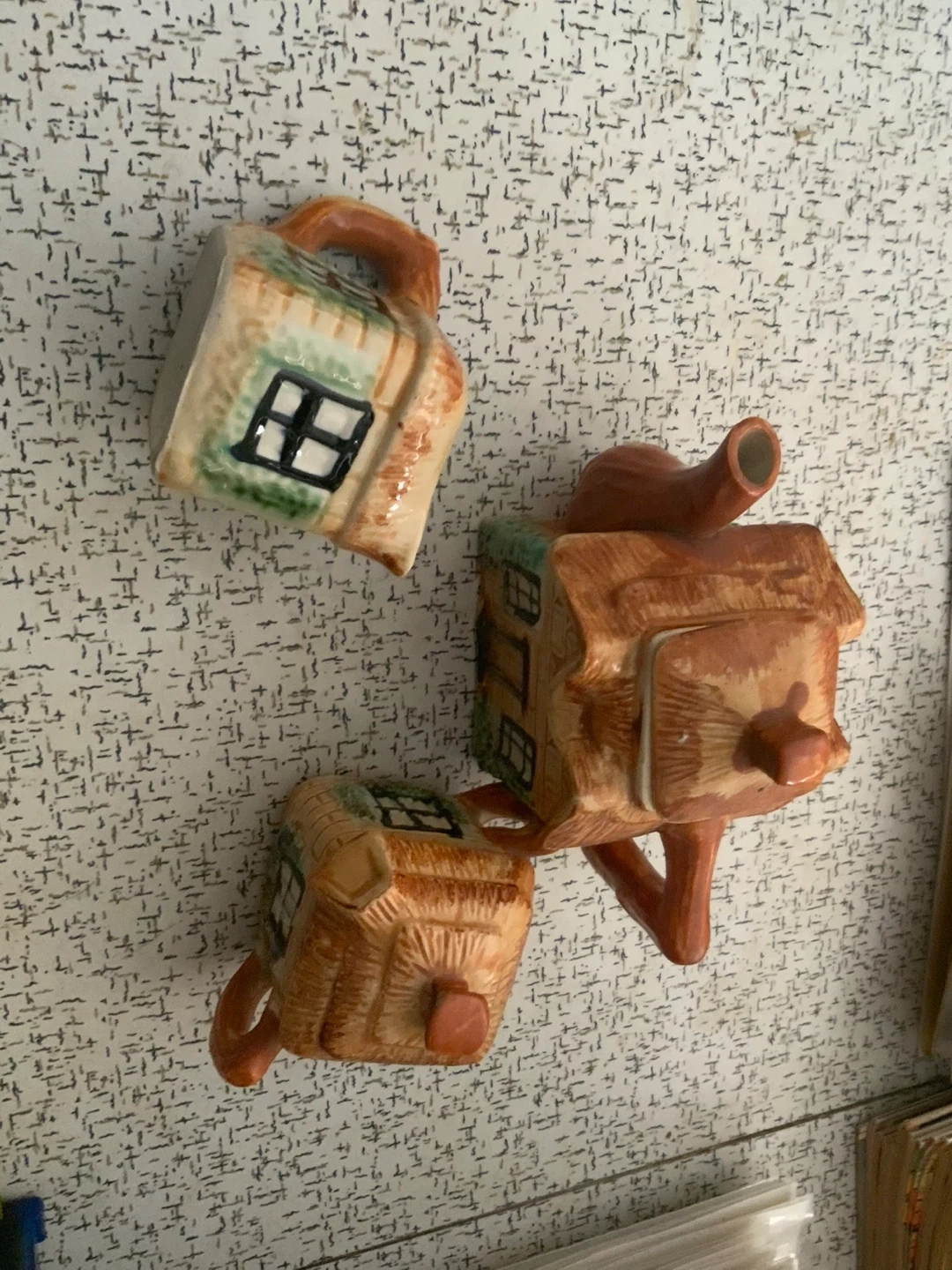 Cute ceramic teapot set designed to look like little houses. Includes the teapot and two small cups. Perfect for a whimsical tea time!