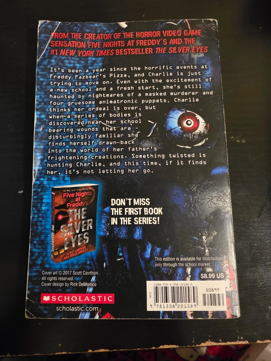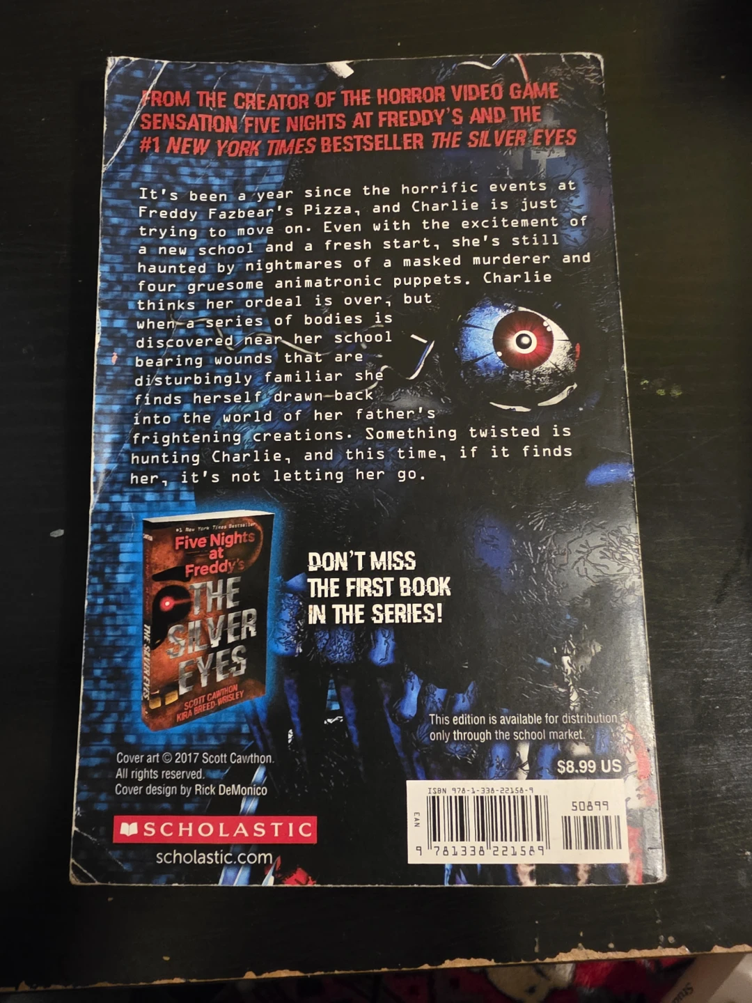 Selling the book "Five Nights at Freddy's: The Twisted Ones" by Scott Cawthon and Kira Breed-Wrisley. It's the sequel to the #1 New York Times bestseller, "The Silver Eyes". A thrilling read for fans of the horror video game sensation!