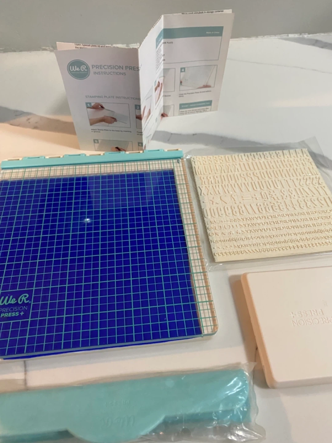 This is a We R Precision Press+ stamping tool. It includes a stamping plate, an alphabet plate with various letters and numbers, and instructions. Great for crafting projects! Never been used.