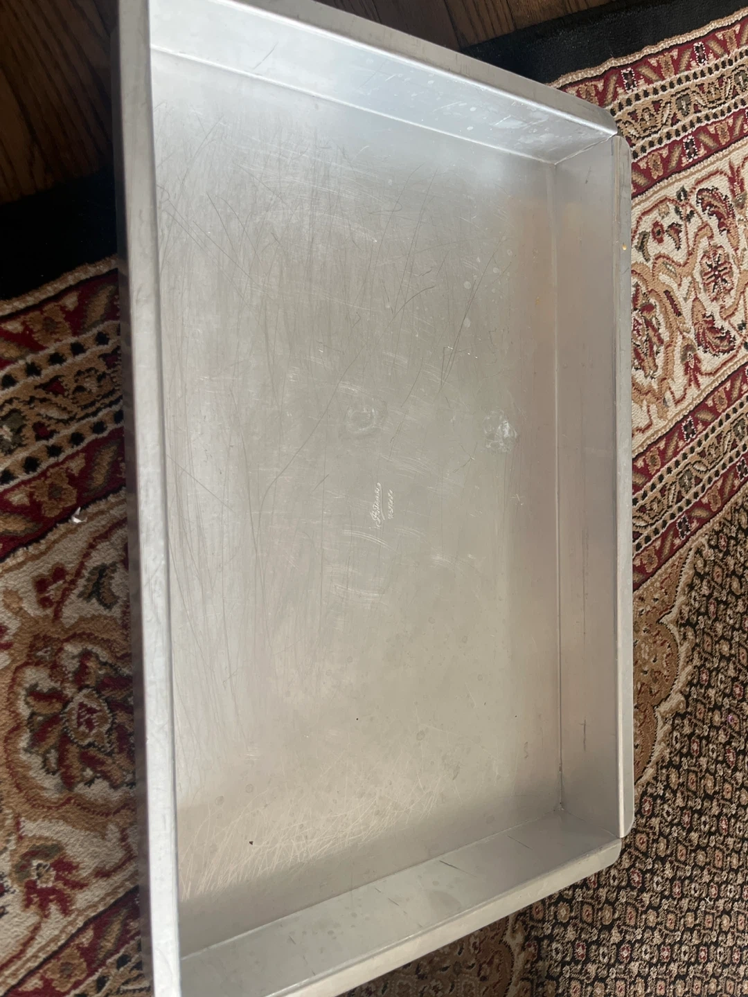 This is a rectangular baking sheet pan. It's made of aluminum and has some scratches from use. Great for baking cookies or roasting veggies!