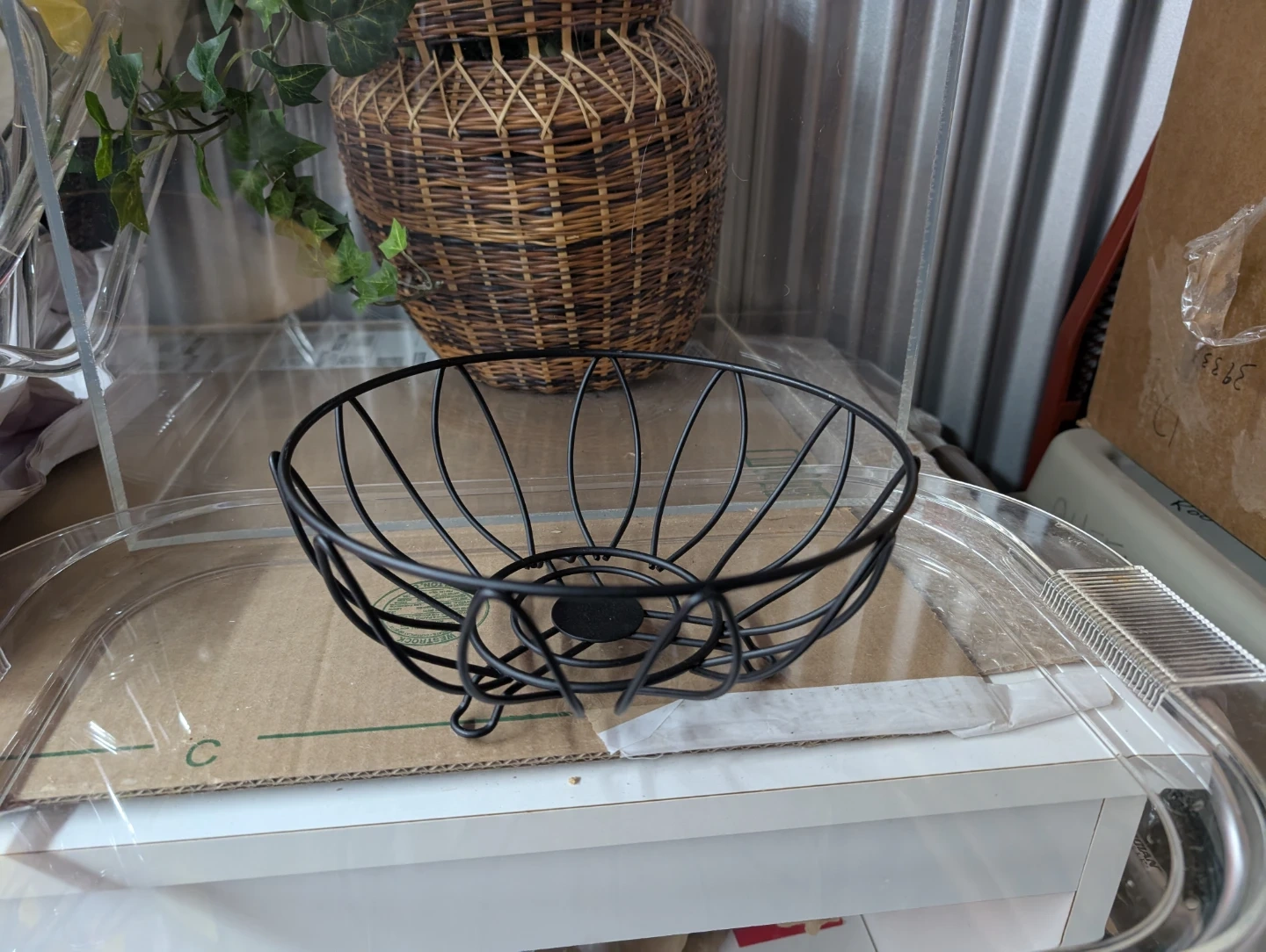 This is a wooden fruit bowl with a black wire basket insert. It's a lovely set for your kitchen counter. The wooden bowl has a warm, natural finish and the wire basket provides an airy display.