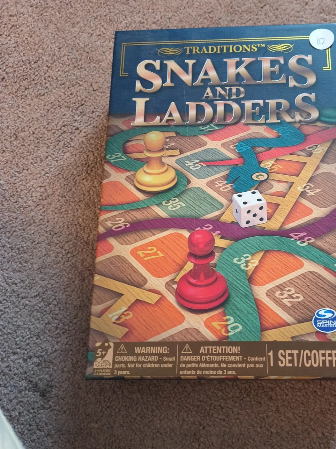 This is a Traditions brand board game of Snakes and Ladders. It's suitable for 2-4 players. The game includes all necessary components for playing, designed for ages 3 years and up.