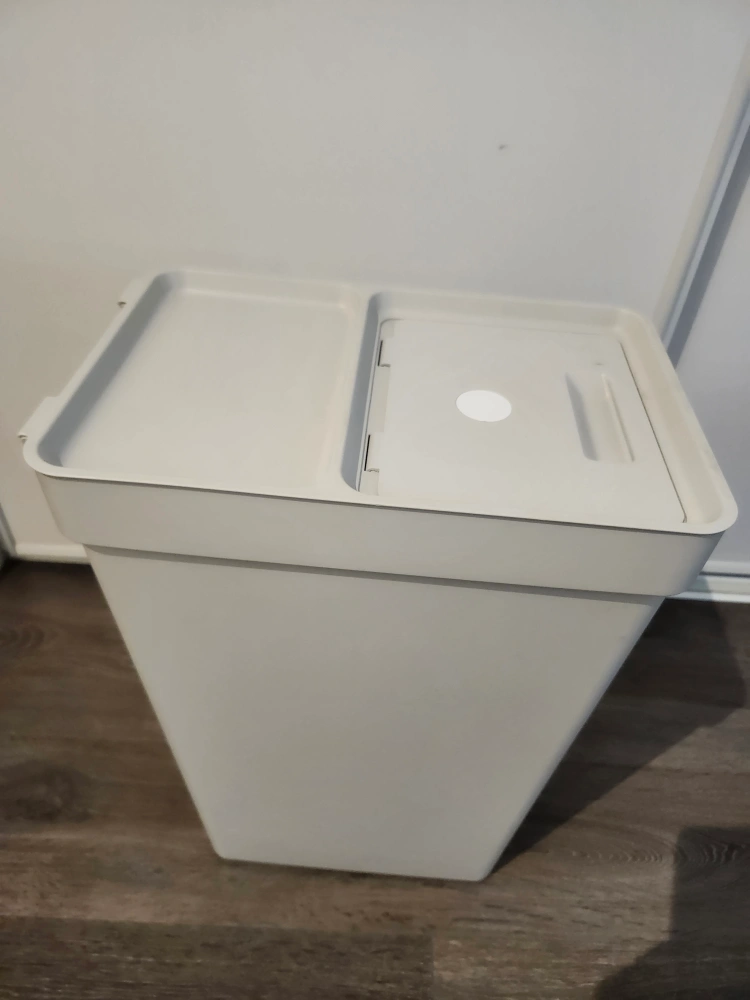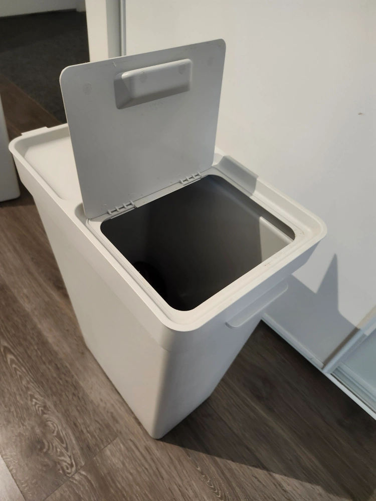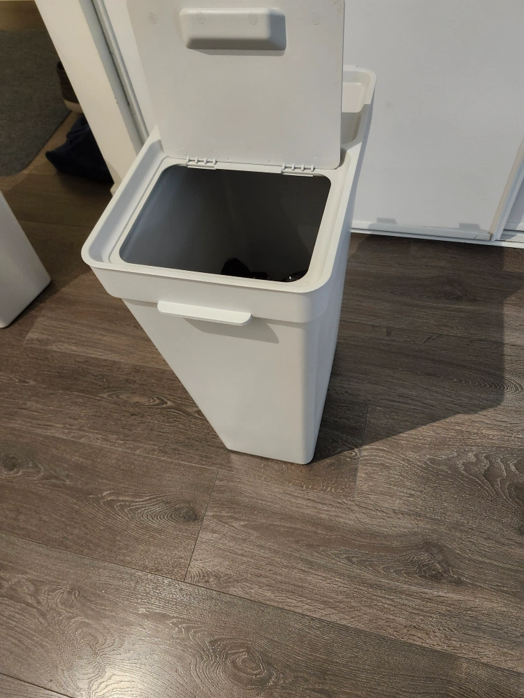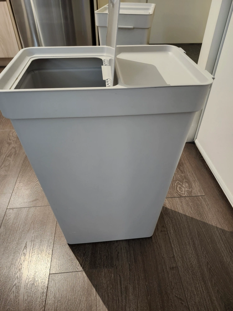 A tall grey bin. Features a hinged lid, and a narrow rectangular design. A perfect piece to add to any living space, bringing a sense of order to your home.