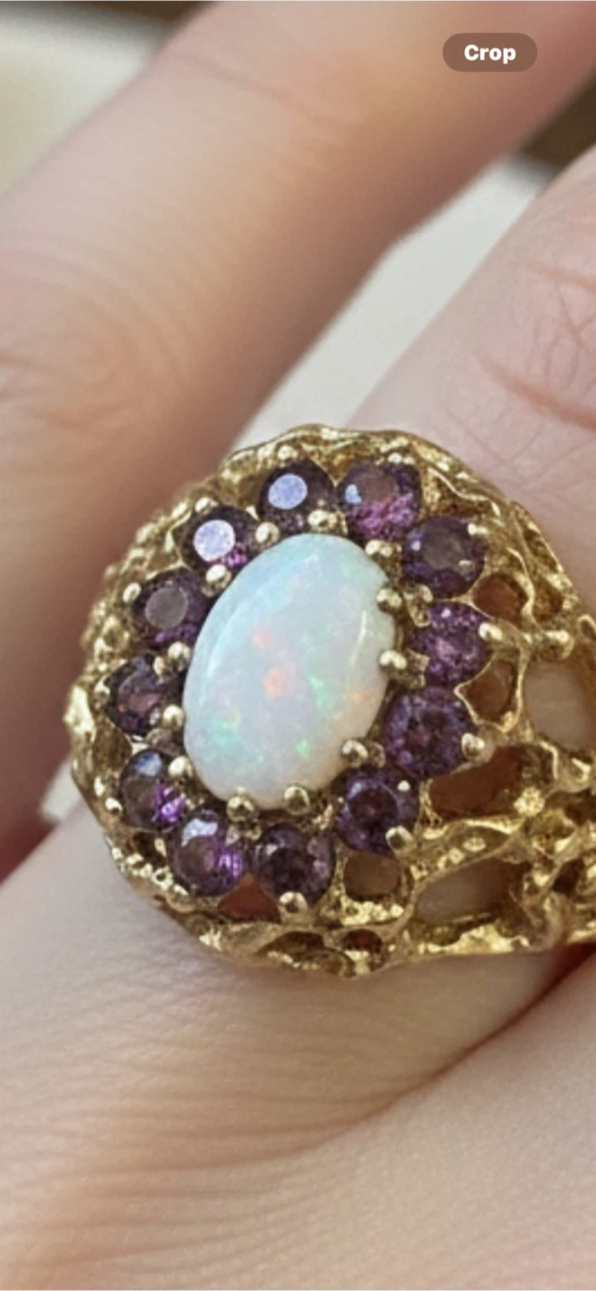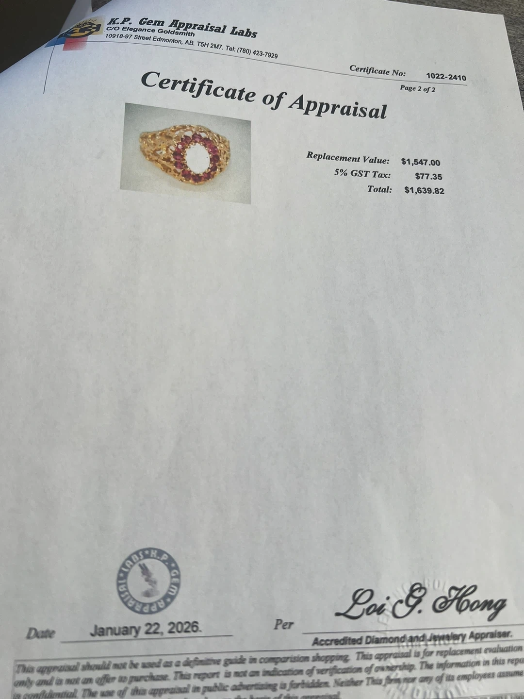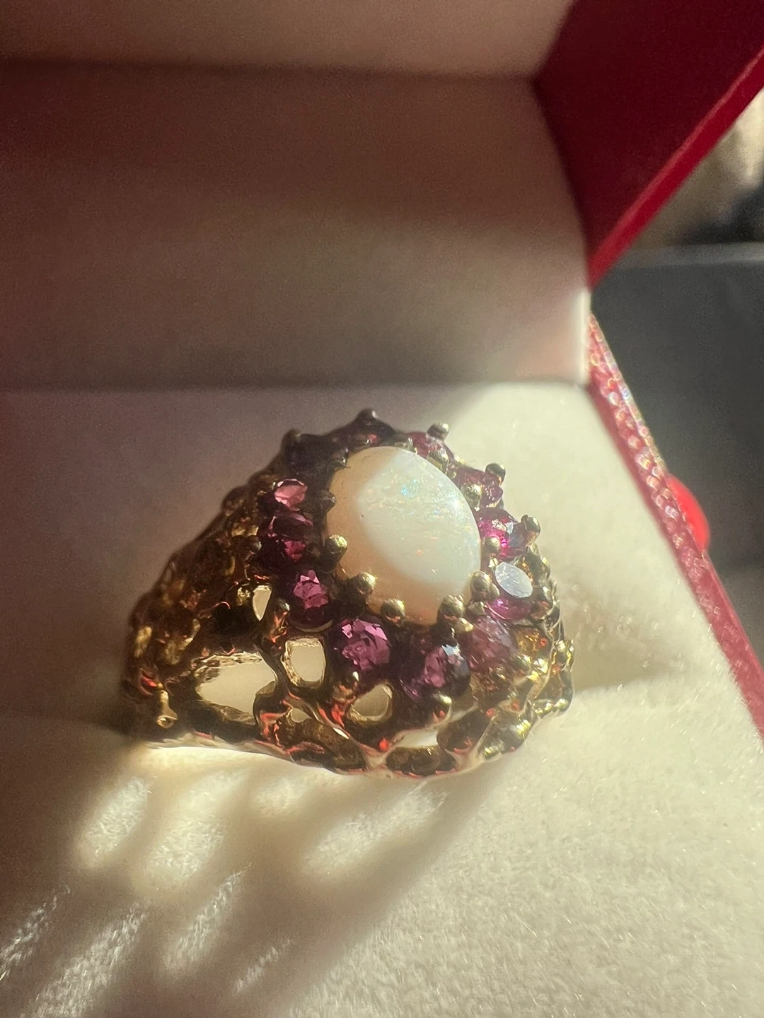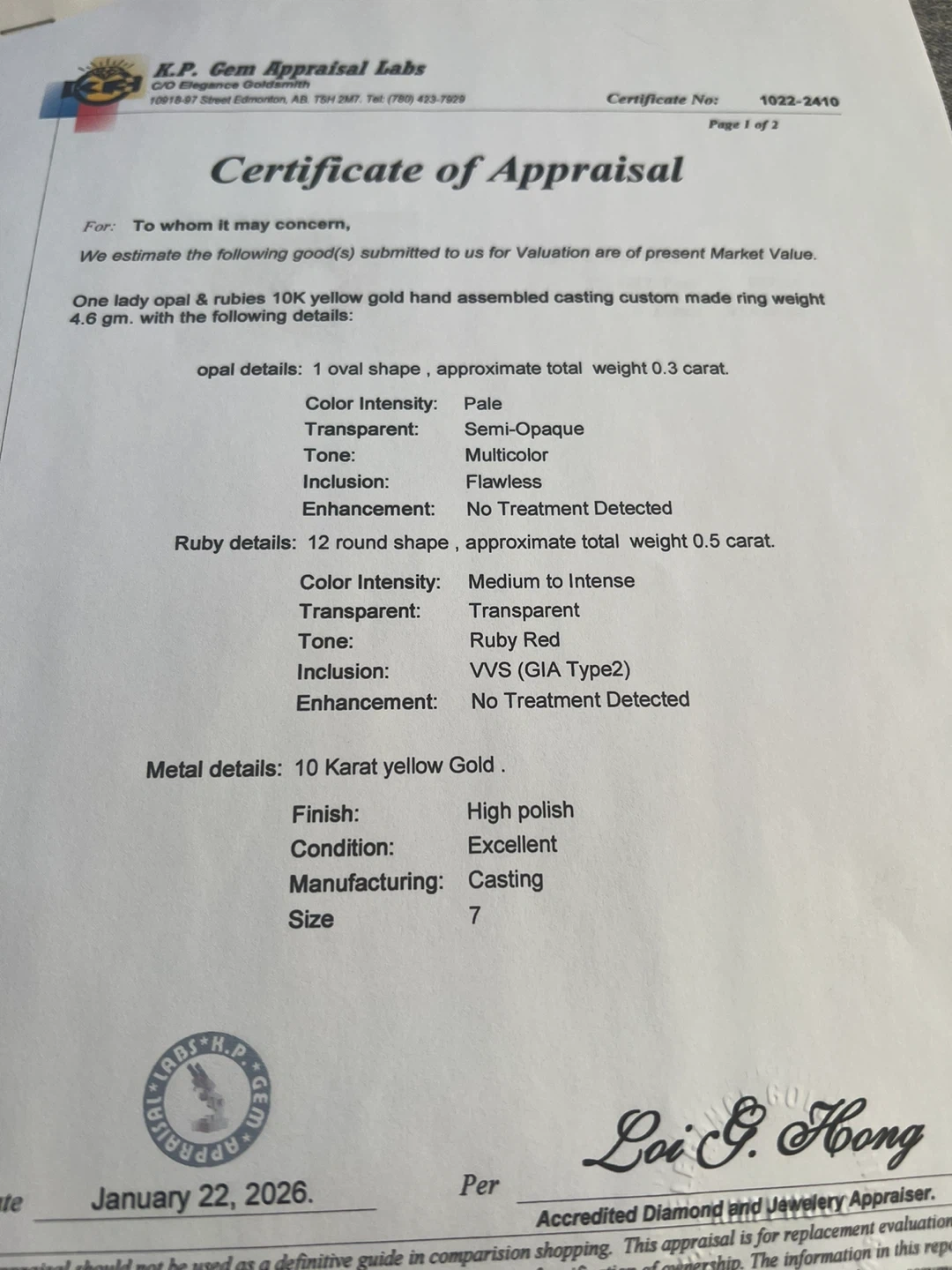 A stunning 10 k gold ring featuring a central opal surrounded by rubies . This unique piece showcases intricate metalwork. The appraisal certificate dates it to January 22, 2026, with a replacement value of $1,547.00.