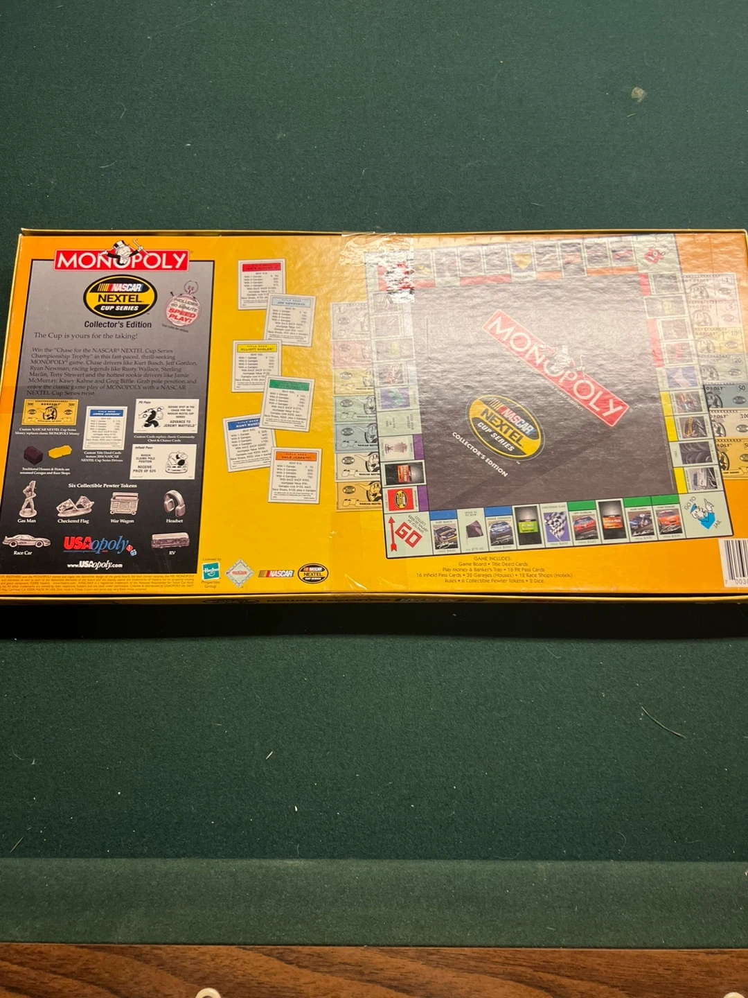 This is the Monopoly Collector's Edition game for the NASCAR Nextel Cup Series. It features custom game pieces and properties related to NASCAR. Includes board, cards, and money.all pieces are accounted for! In excellent condition