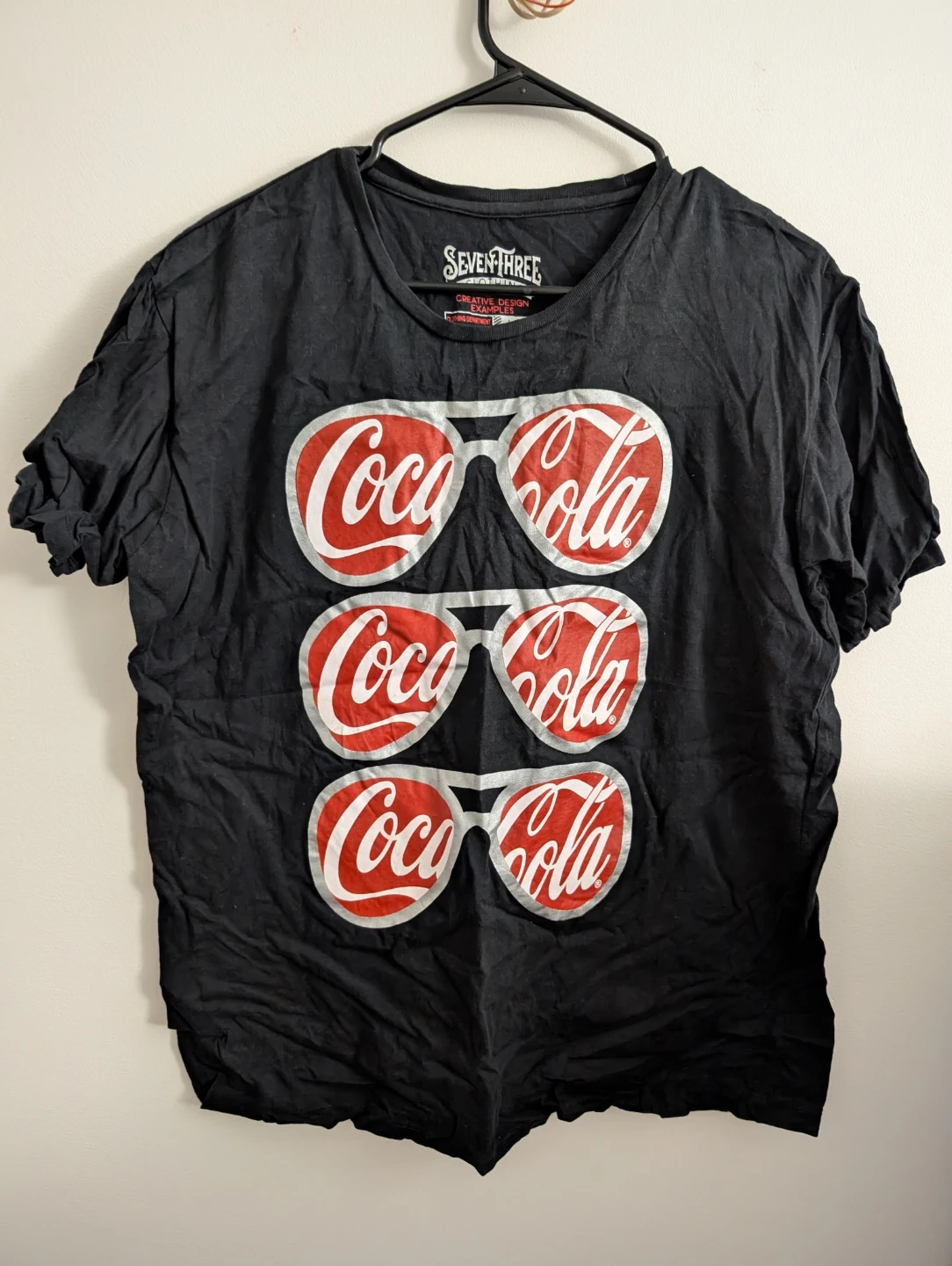 Selling a Coca-Cola T-shirt by Seven Three Clothing in a size large. It's black and features a fun design with Coca-Cola logos shaped like sunglasses. Great for any Coca-Cola fan!