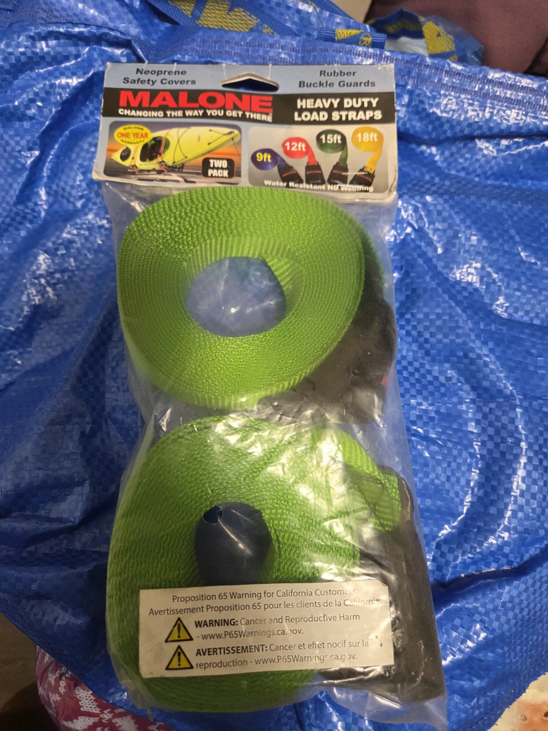 These are Malone Heavy Duty Load Straps, sold as a two-pack. They are water-resistant with neoprene safety covers and rubber buckle guards. The straps come with included components.