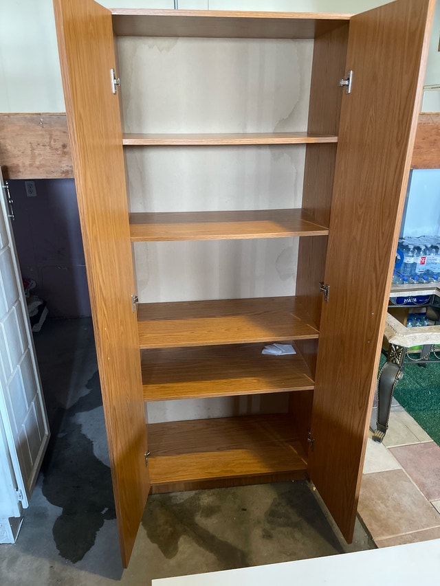 This is a used wardrobe with a traditional wood finish. It stands approximately 6 feet tall and offers ample storage with multiple shelves inside. It's perfect for organizing clothes or other household items. The dimensions are as follows: Height: 72 inches, Depth: 16 inches, Width: 31 inches. While it has been a reliable piece of furniture, I'm making space in my home and hoping it finds a new purpose elsewhere. If you're seeing this ad, it means the wardrobe is still available. Cash accepted.