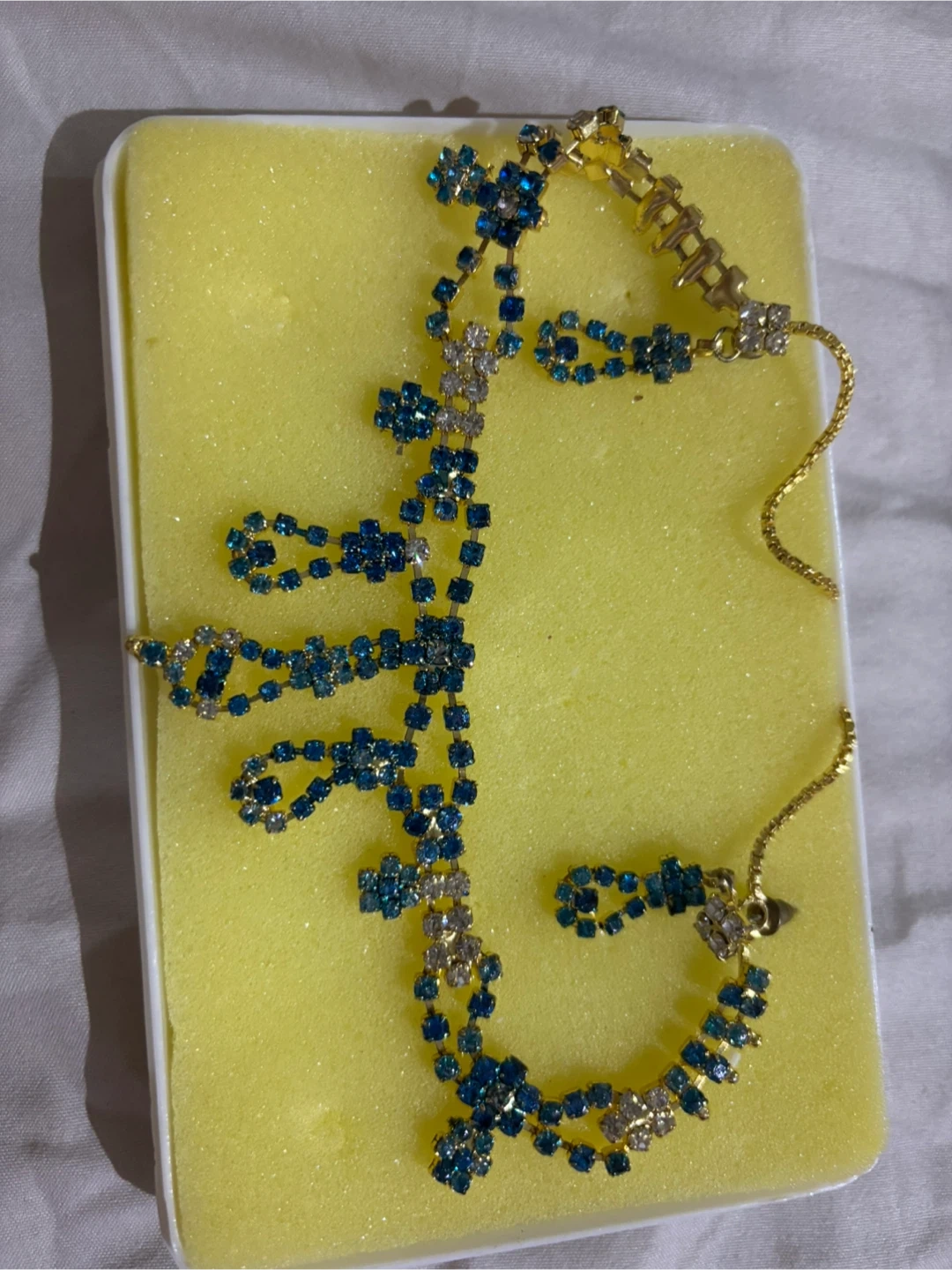 This necklace set features blue and clear rhinestones arranged in floral patterns. It comes with a matching pair of earrings. The chain is gold-toned with a delicate adjustable clasp.