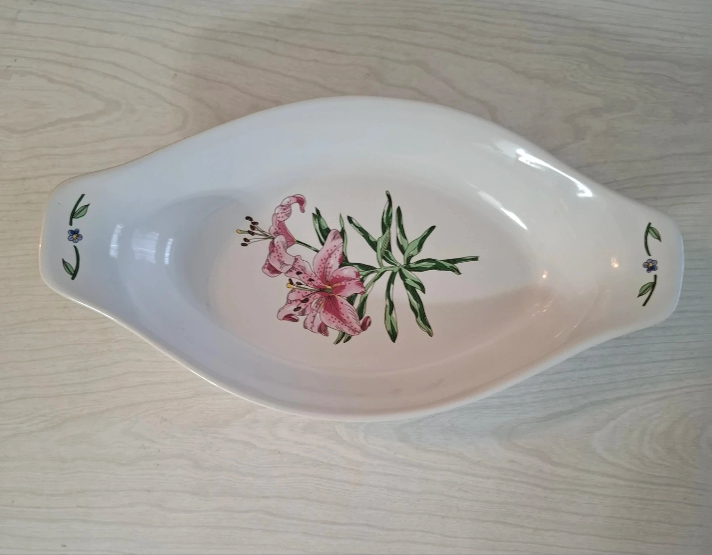 White oval dish featuring a delicate pink lily floral design. It has handles on both ends for easy transport. Ceramic material.