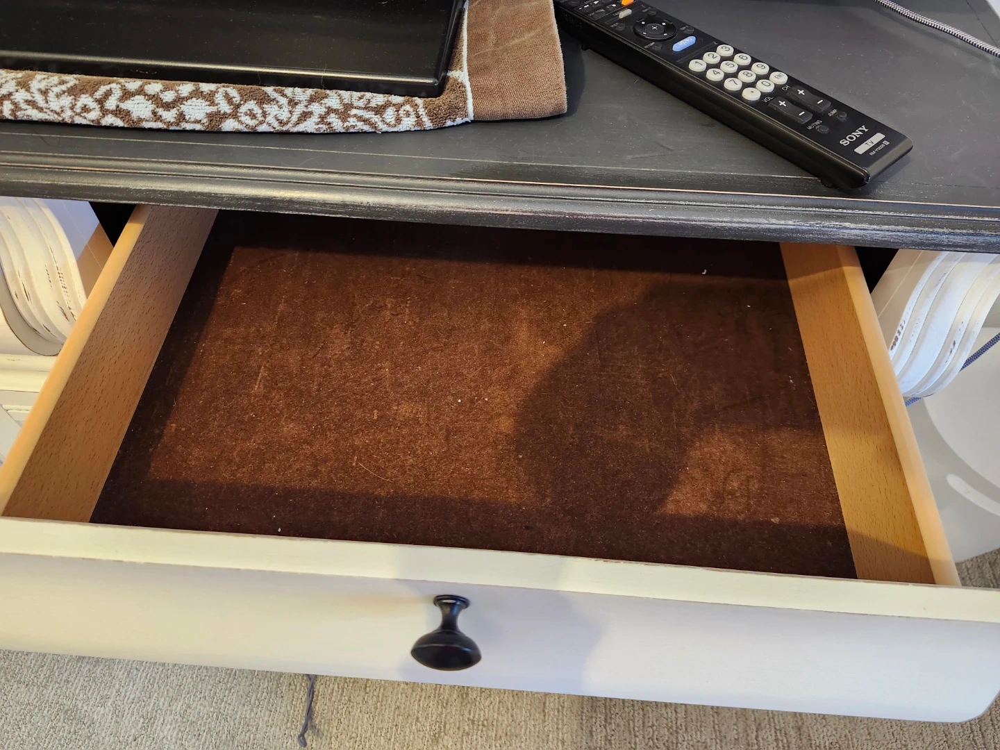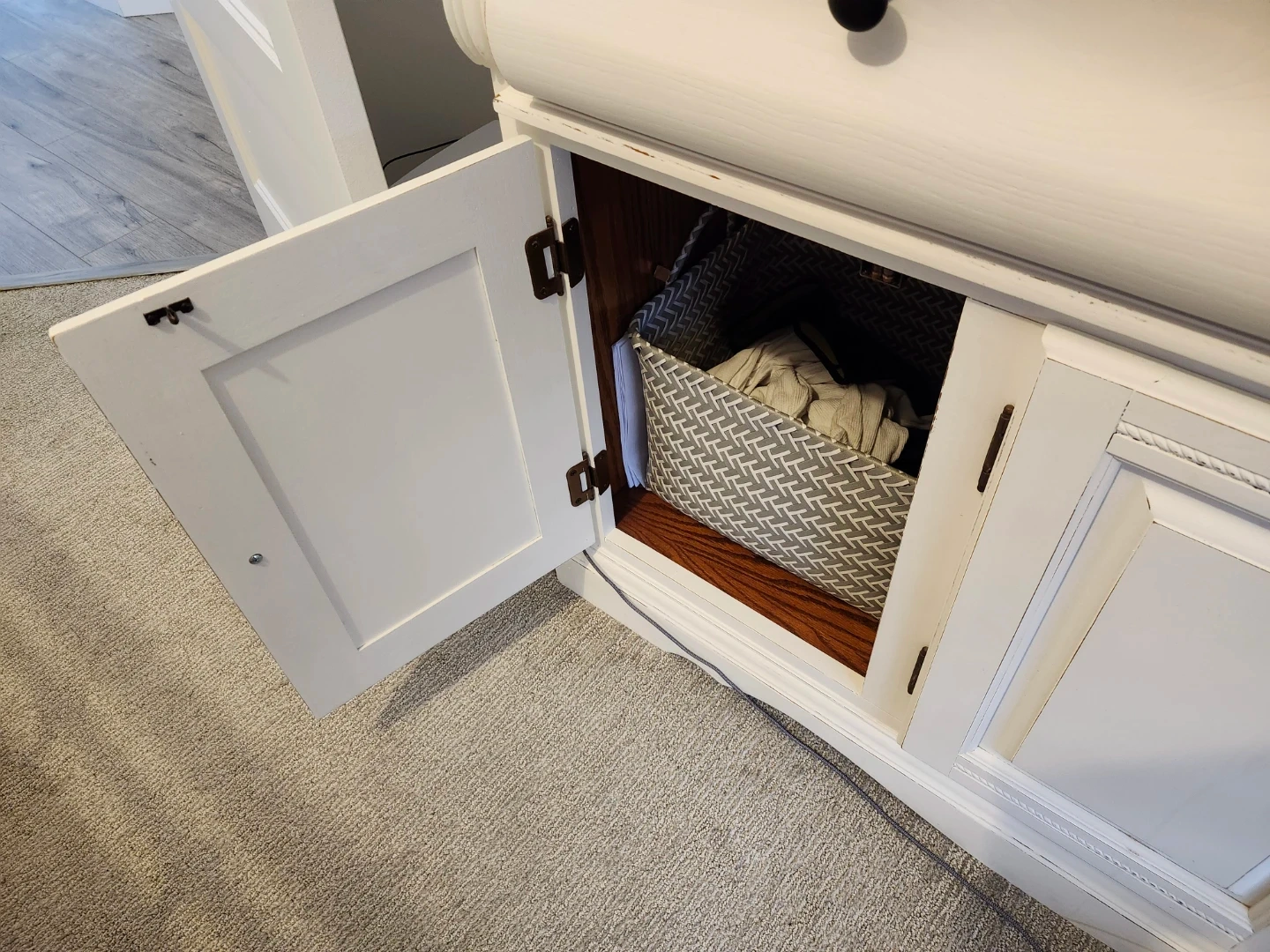 This white sideboard with a graphite finish top has two two drawers and three doors with a distressed finish and graphite colored knobs. It's a stylish storage solution for your home. Perfect for a living room, bedroom, games room etc.