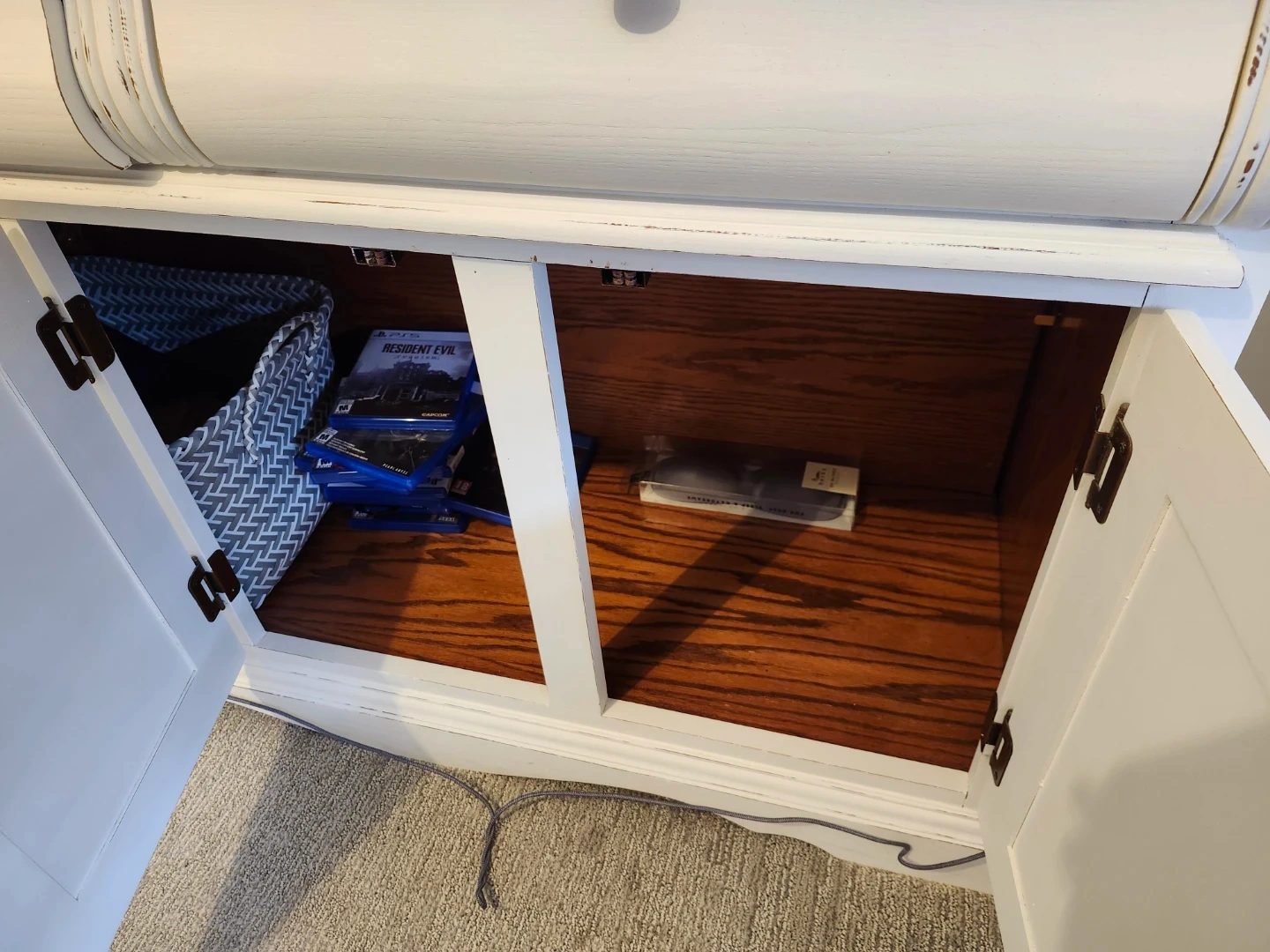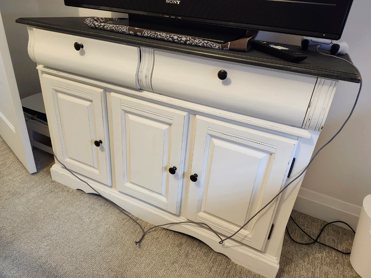 This white sideboard with a graphite finish top has two two drawers and three doors with a distressed finish and graphite colored knobs. It's a stylish storage solution for your home. Perfect for a living room, bedroom, games room etc.