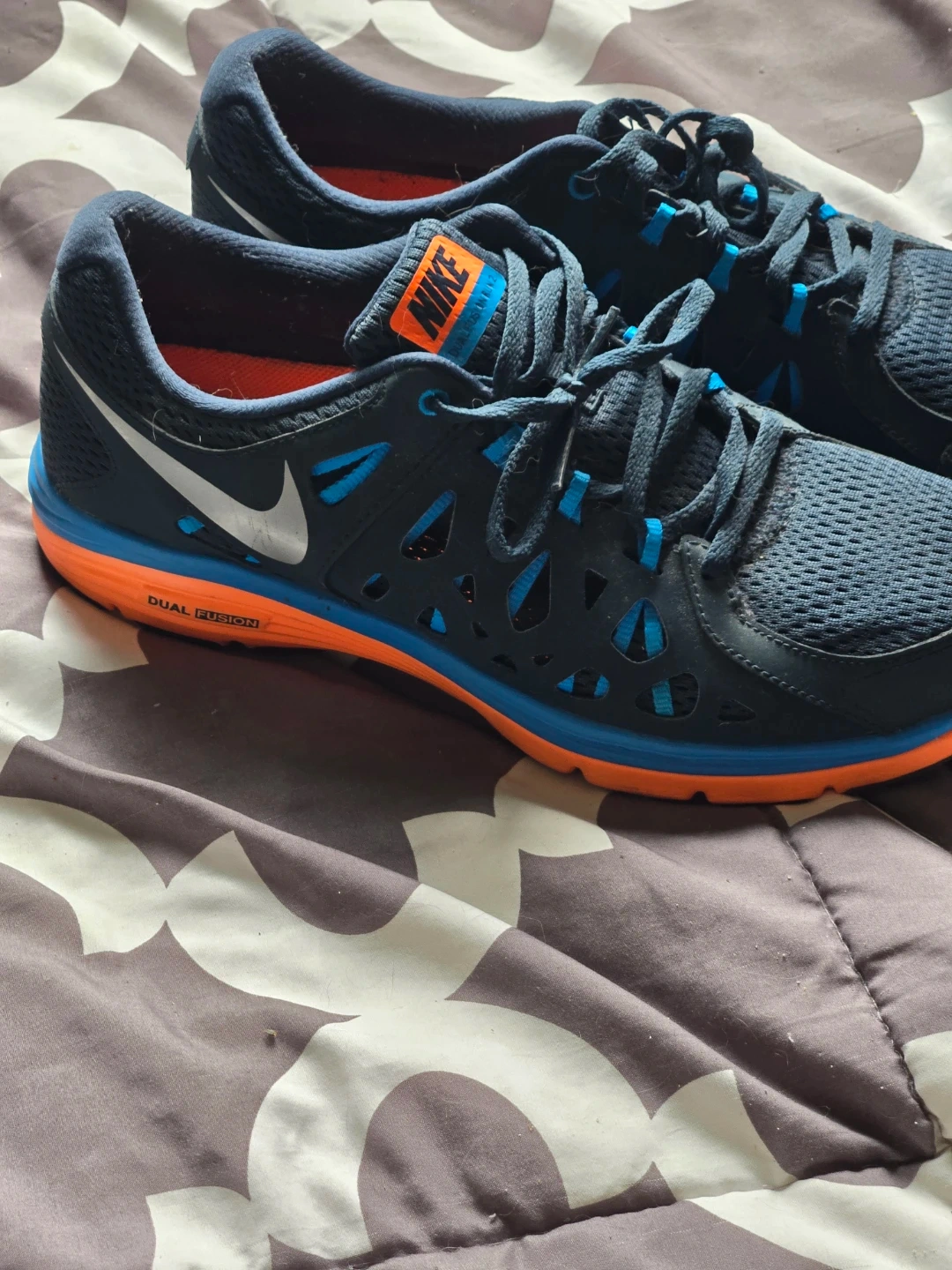 Selling a pair of Nike Dual Fusion TR 4 running shoes in men's size 10.5. The shoes feature a navy blue and orange colour scheme. Great for running or casual wear!