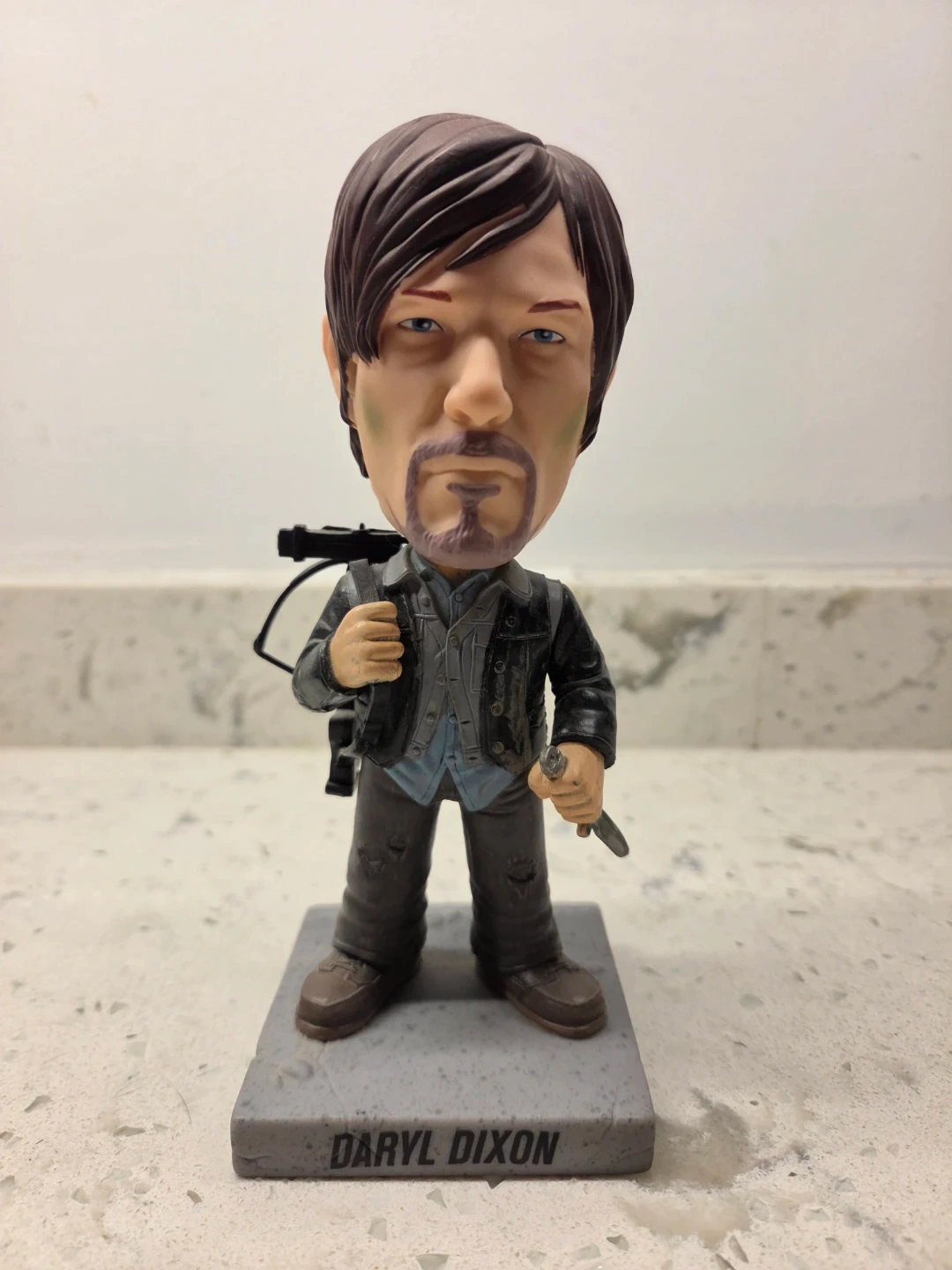 This is a Daryl Dixon bobblehead from The Walking Dead. It features him with his signature crossbow and knife. The figure is designed with distressed clothing and realistic facial features.