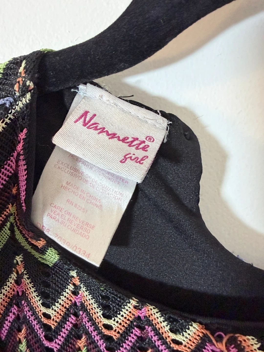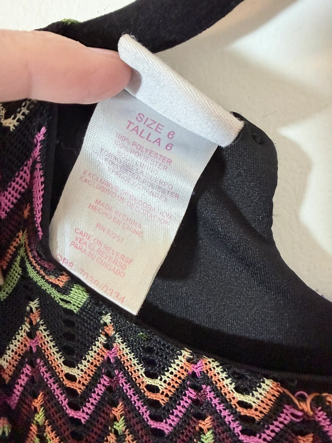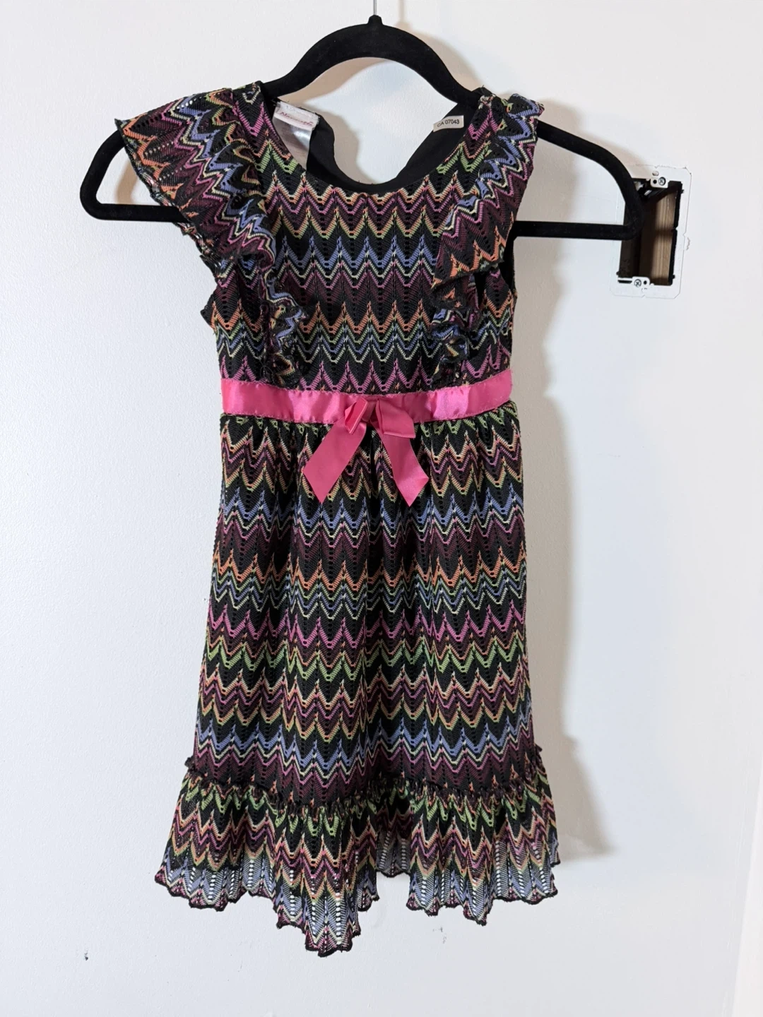 A Nanette Nanette Girl dress in size 6. It's made of 100% polyester and features a colourful chevron pattern with ruffled details and a pink bow. Perfect for a little one's wardrobe!