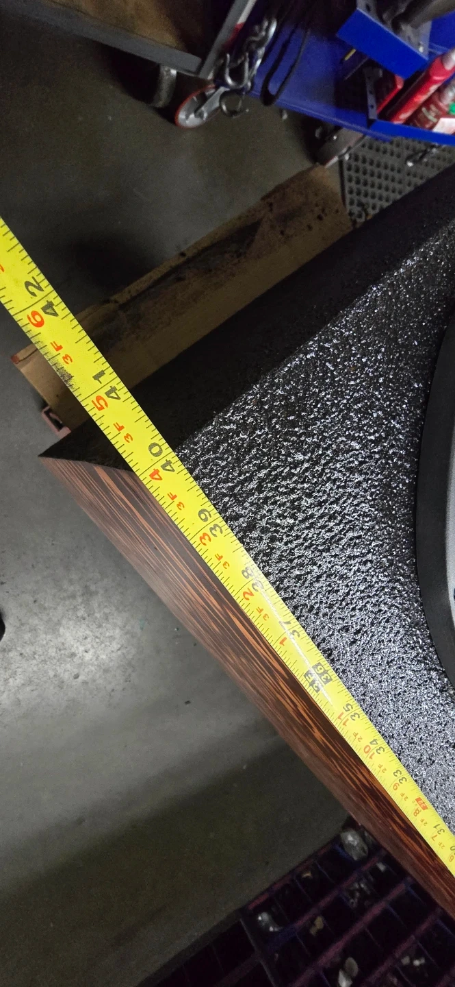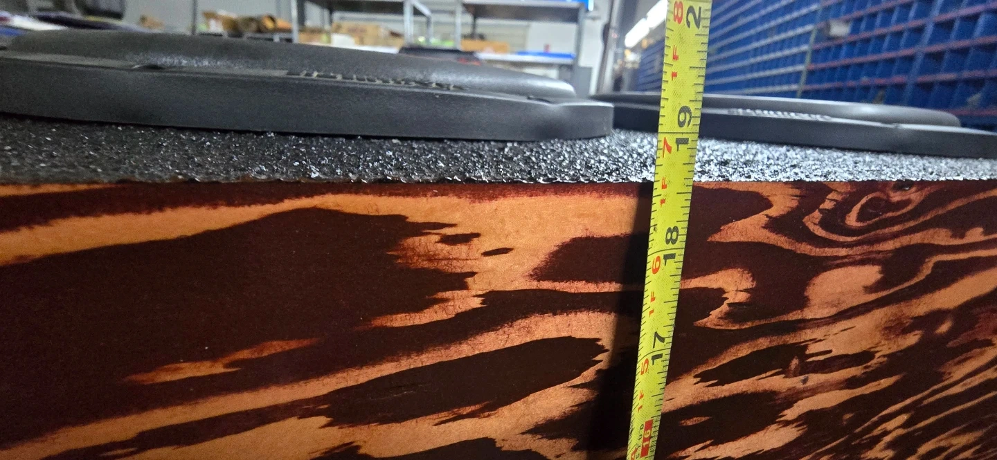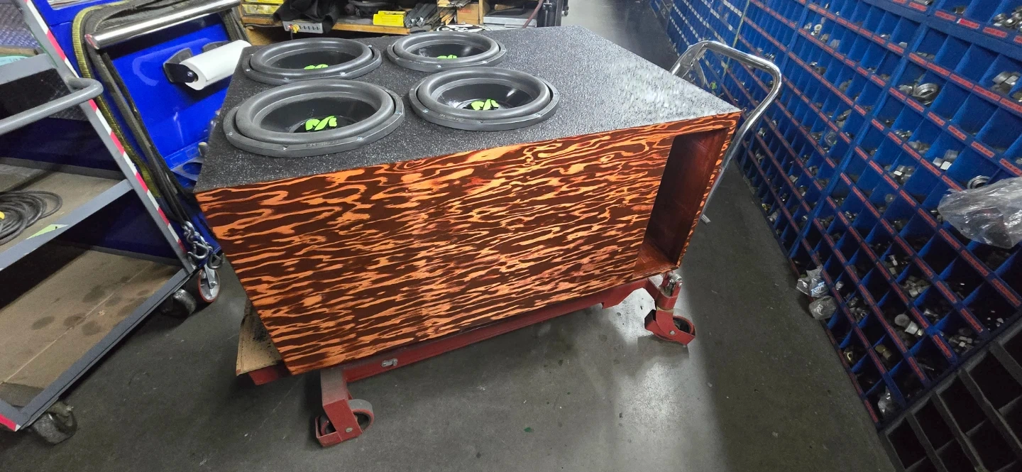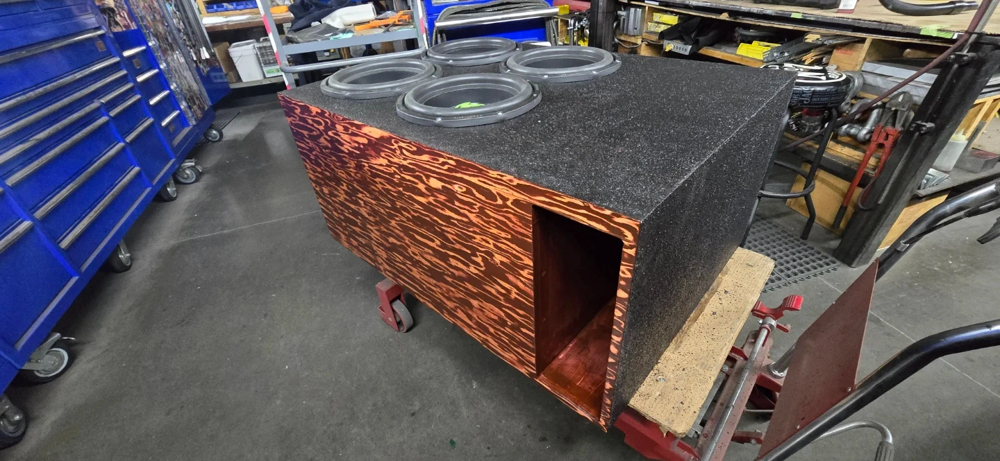 Custom made enclosure rhino lined and front face stained cherry red