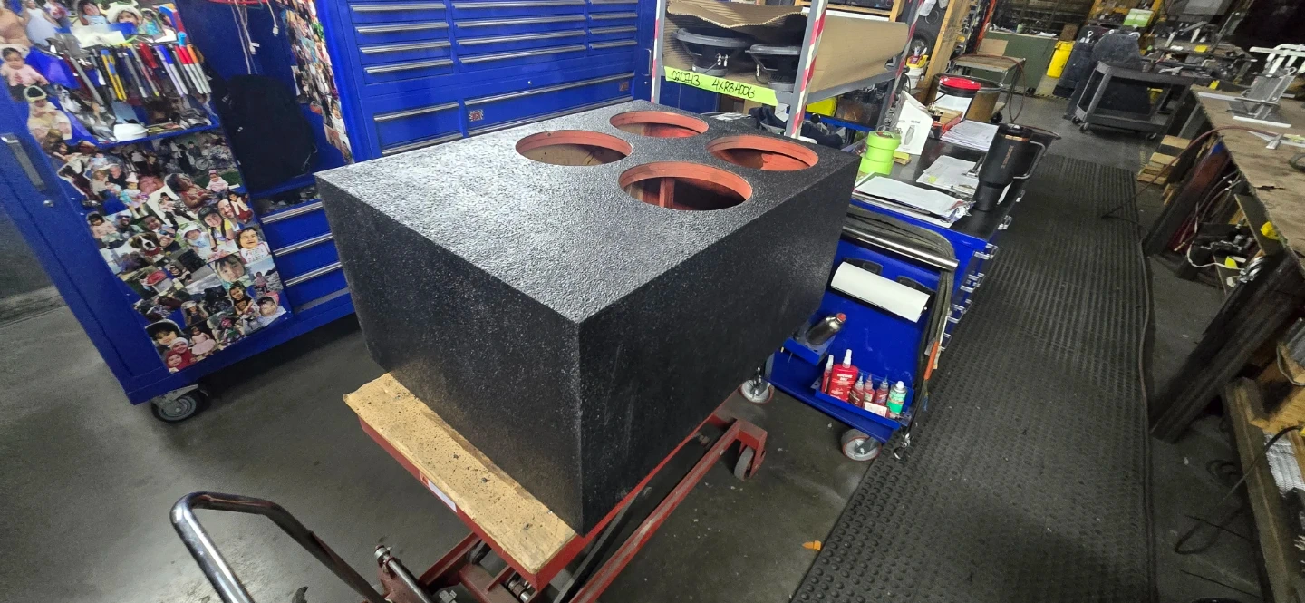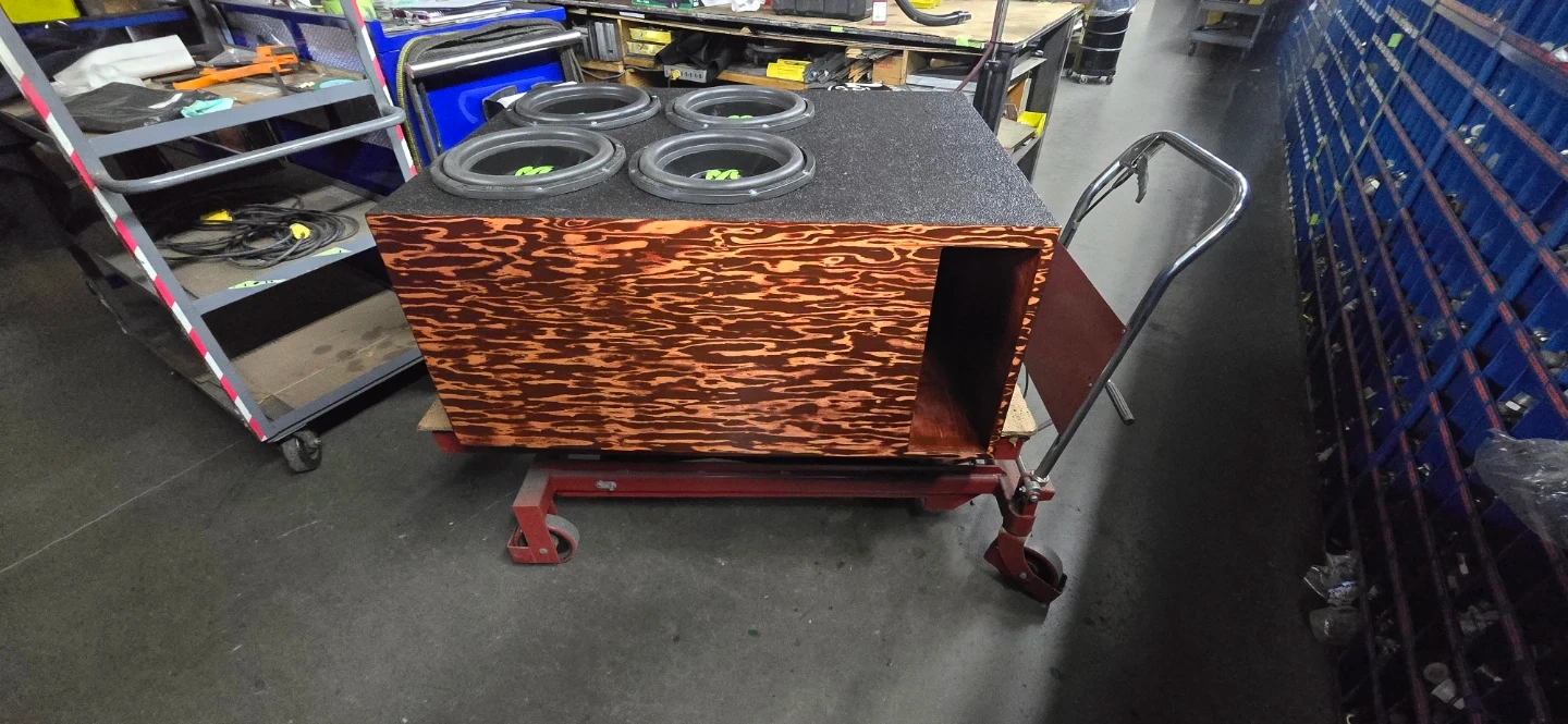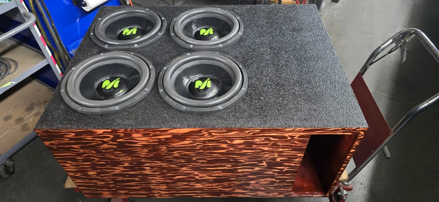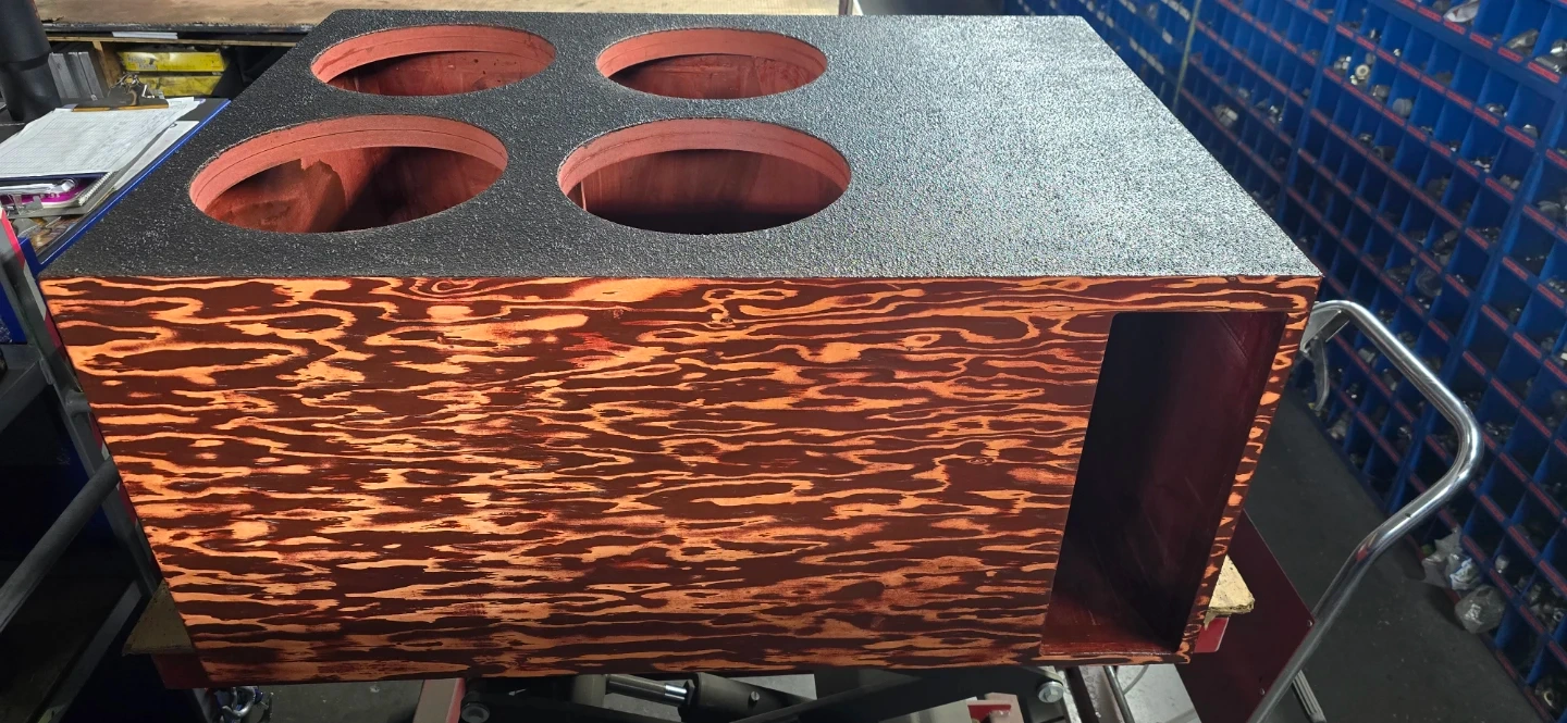 Custom made enclosure rhino lined and front face stained cherry red