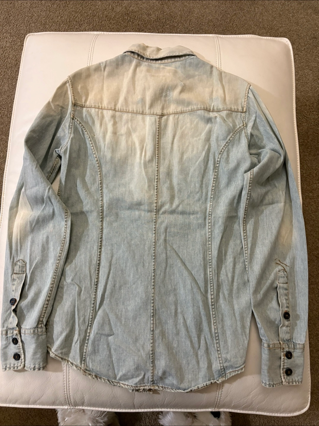 Denim shirt featuring a button-down closure. Long sleeves with buttoned cuffs. Two front pockets. A great shirt for a day out with friends. Some stains I never tried to take off. Pickup Cambie road Richmond near IKEA