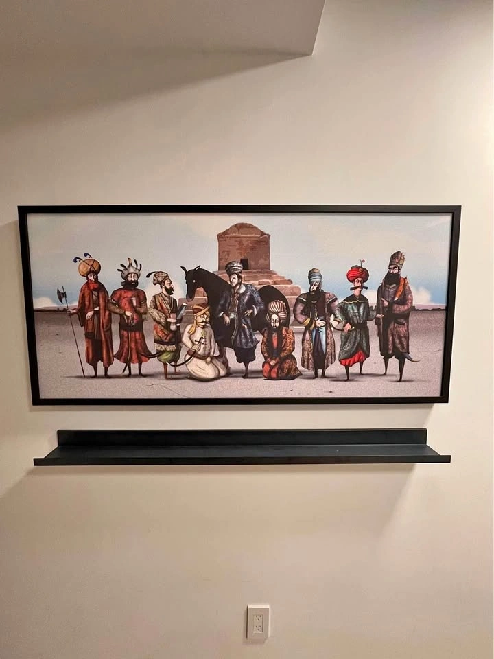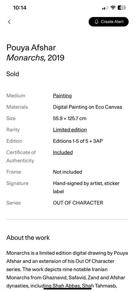 Hand signed. Comes with certificate of authenticity. Monarchs is a limited edition digital drawing by Pouya Afshar and an extension of his Out Of Character series. The work depicts nine notable Iranian Monarchs from Ghaznavid, Safavid, Zand and Afshar dynasties, including Shah Abbas, Shah Tahmasb, Shah Esmail, Nader Shah, Karim Khan Zand, Lotf Ali Khan Zand, Shah Sultan Hossein, Sultan Mahmood Khodabandeh, and Sultan Mahmood Ghaznavi.