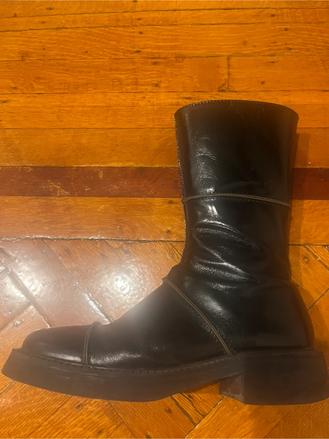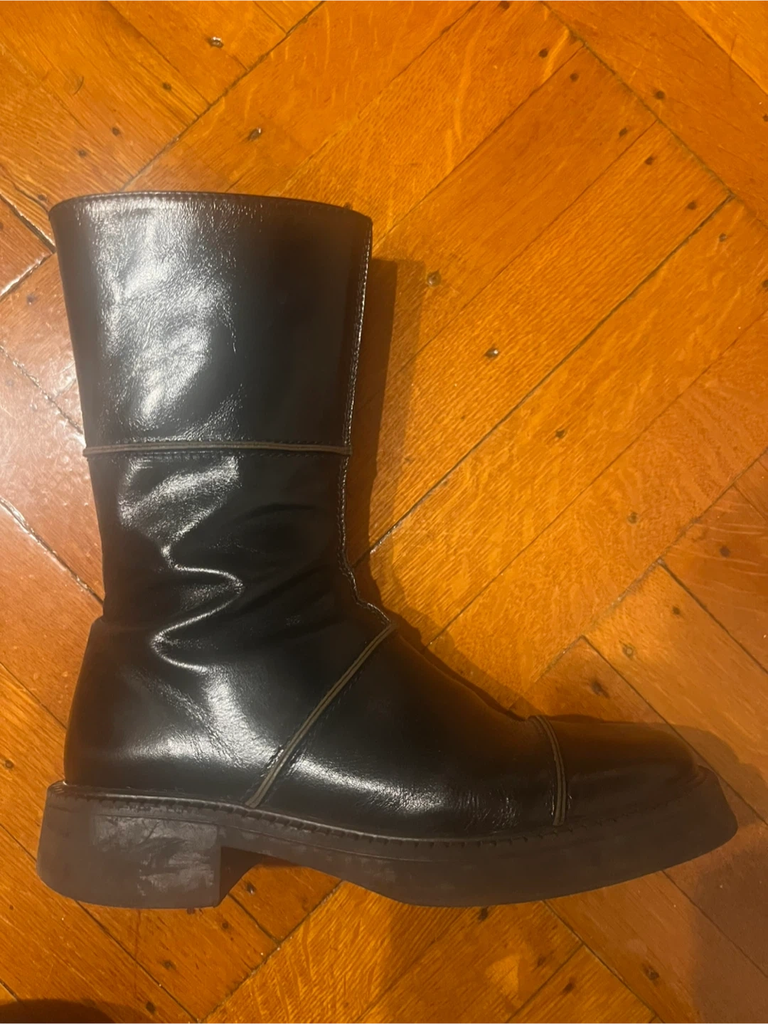 I love these boots but they’re just not working for me! Hopefully someone out there can get more use out of them 🫶🏼🥲 marked as EU39/ US8.5 this color is no longer sold description from website: Dahlia is fitted zip-up, square-toed ankle boot crafted in a glossy, mirror-like Florantique brush-off leather that has a two-toned distressed texture around the base of the upper. The design is constructed from a series of leather panels with raised seam detailing. It features a very wearable low heel and a robust rubber sole with welt detail. Florantique brush-off leather Inside zip Vegetable tan cow leather lining Ultra-cushioned memory foam padded insole Heel Height: 3 cm Please note: This style runs small. If you're between sizes (or wish for more room around the calf and ankle) we recommend sizing up.