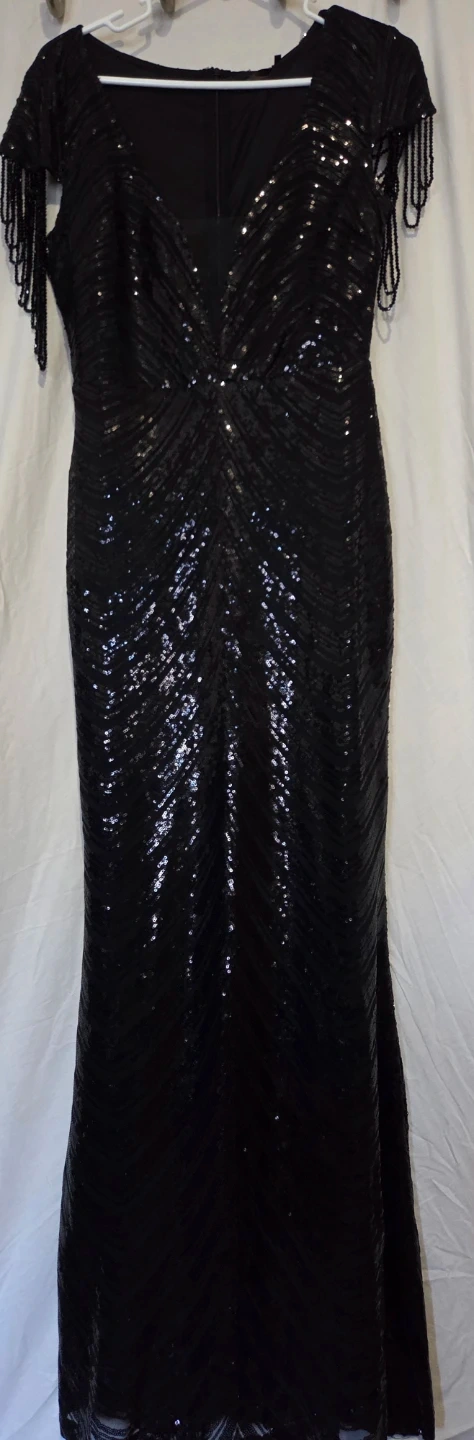BABEYOND TRULY TIMELESS. Selling a beautiful black sequin dress that comes with a matching beaded purse! The dress has a flattering V-neckline and is covered in shimmering sequins. The beaded purse complements the dress perfectly, making it a stunning set for any special occasion.