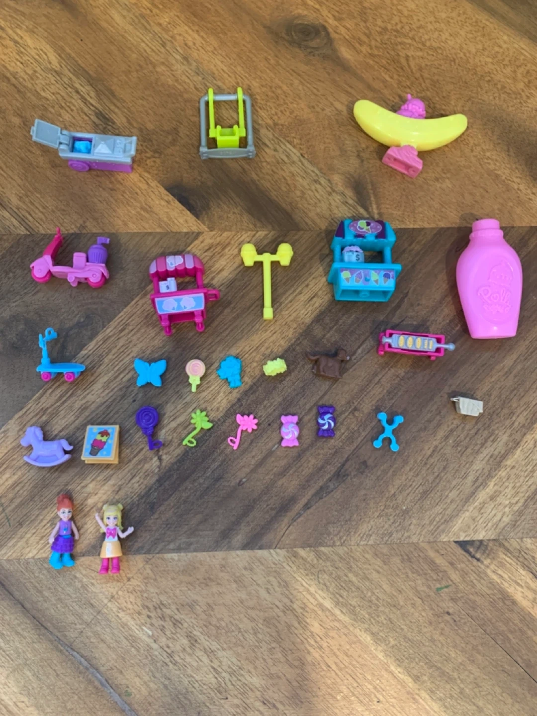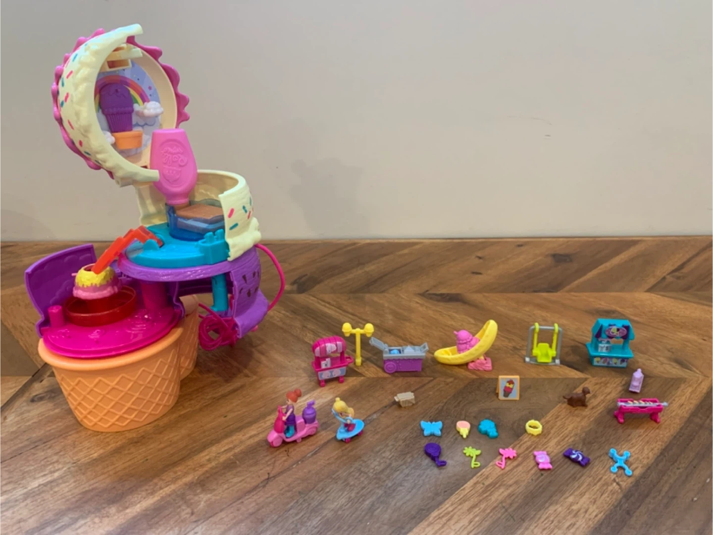 This is a Polly Pocket Ice Cream Sweet Surprise compact playset. It comes with lots of tiny accessories, including figures, a scooter, and various ice cream treats. It's a fun playset for imaginative adventures!