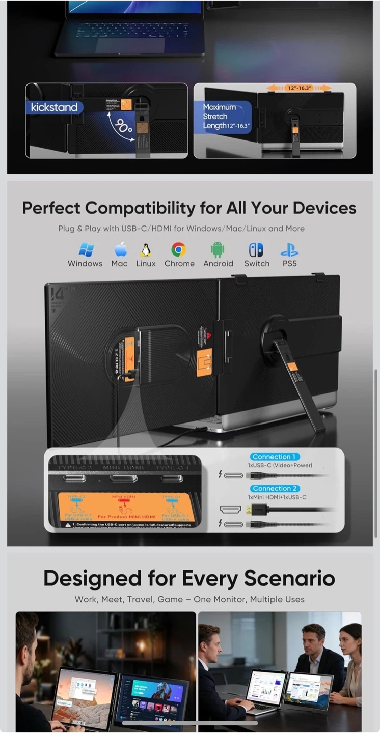 This 14" portable monitor extends your laptop's workspace with a 1080P Full HD IPS display. It's ultra-thin at just 0.30" and features a kickstand for stability. Compatibility is broad, supporting Windows, Mac, Linux, Chrome, Android, and Switch via USB-C or Mini HDMI connections.