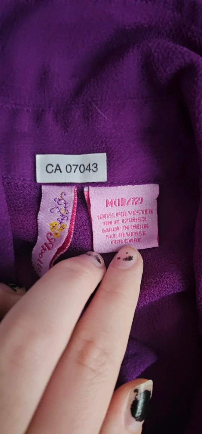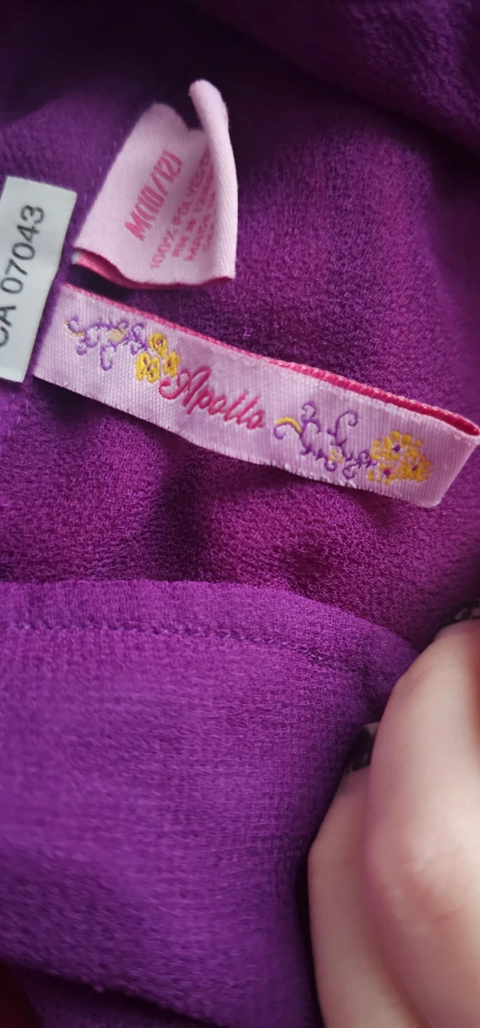 This Apollo purple long-sleeve shirt is made of 100% polyester. It features a tie-front design with two buttoned chest pockets and a collared neckline. Size M (10/12).