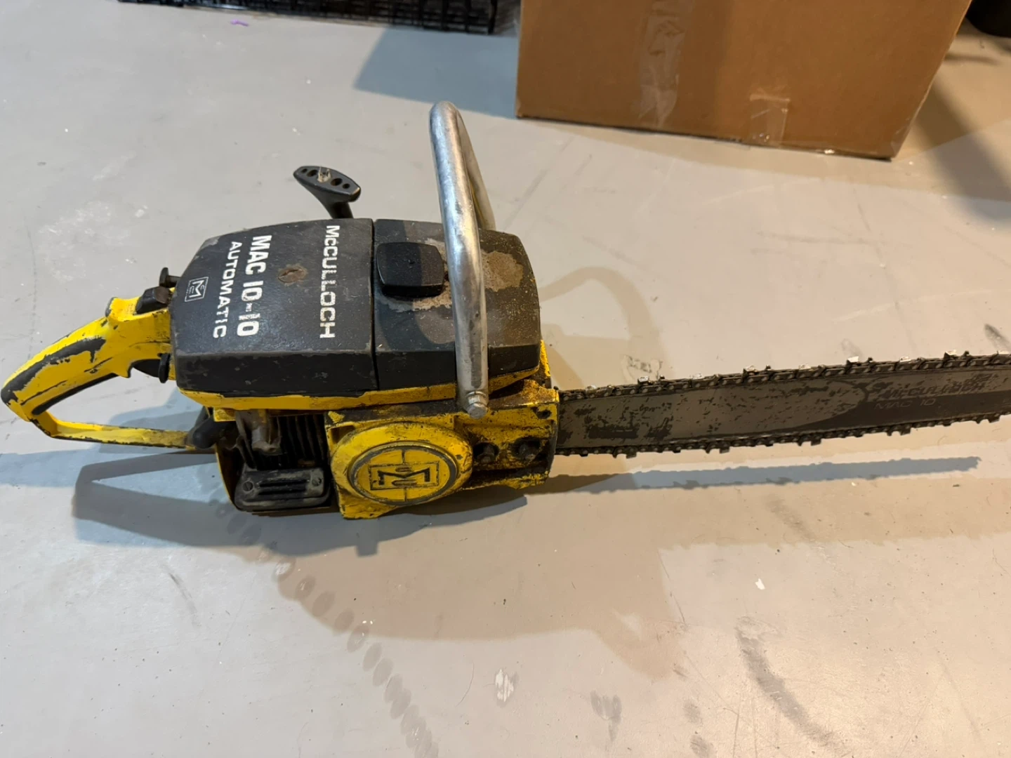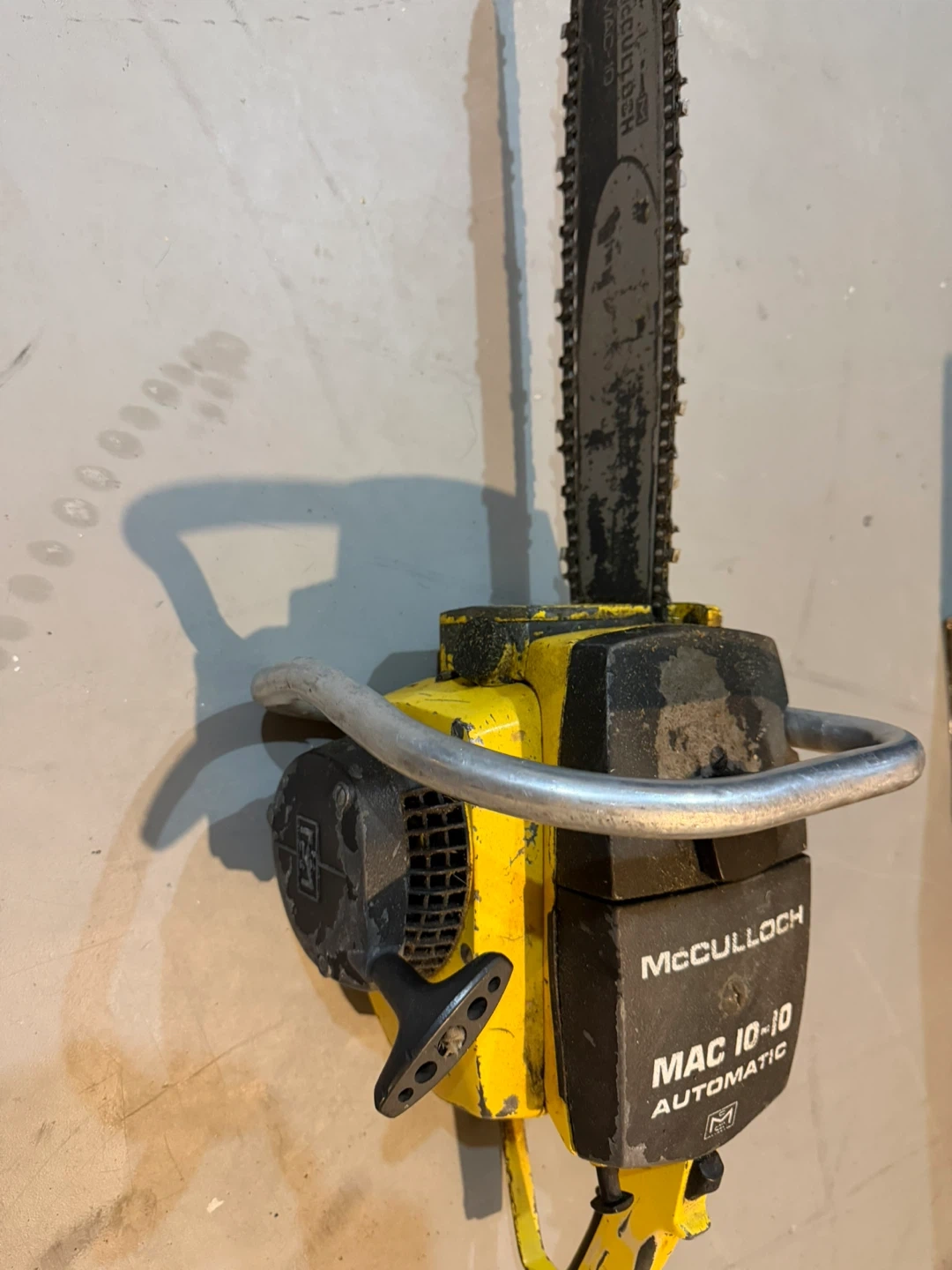 This is a McCulloch MAC 10-10 Automatic chainsaw. It features a yellow and black body with a metal handle. The bar and chain are included.
