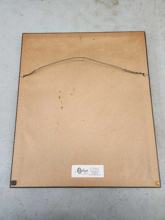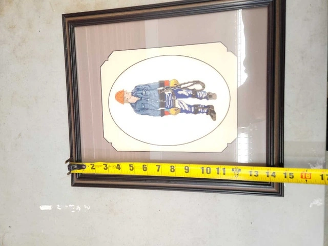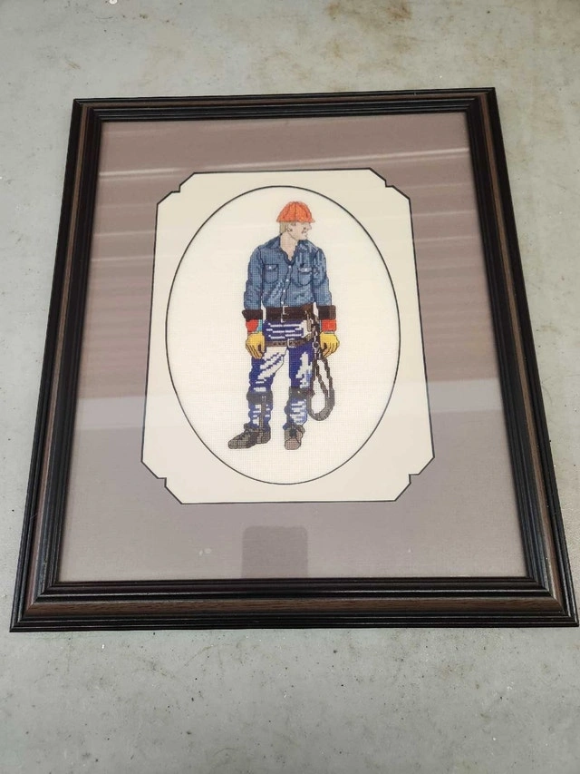 This framed cross-stitch artwork features a detailed depiction of a lineman, complete with all the gear. This piece, while previously cherished, remains in good condition. The artwork measures 16 inches in height and 14 inches in width. It's ready to hang and would make a quirky addition to any room. Subject: Lineman. Condition: Good. Dimensions: 16" H x 14" W. Price: $40 CAD. If you're seeing this ad, the cross-stitch is still available.