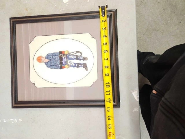This framed cross-stitch artwork features a detailed depiction of a lineman, complete with all the gear. This piece, while previously cherished, remains in good condition. The artwork measures 16 inches in height and 14 inches in width. It's ready to hang and would make a quirky addition to any room. Subject: Lineman. Condition: Good. Dimensions: 16" H x 14" W. Price: $40 CAD. If you're seeing this ad, the cross-stitch is still available.