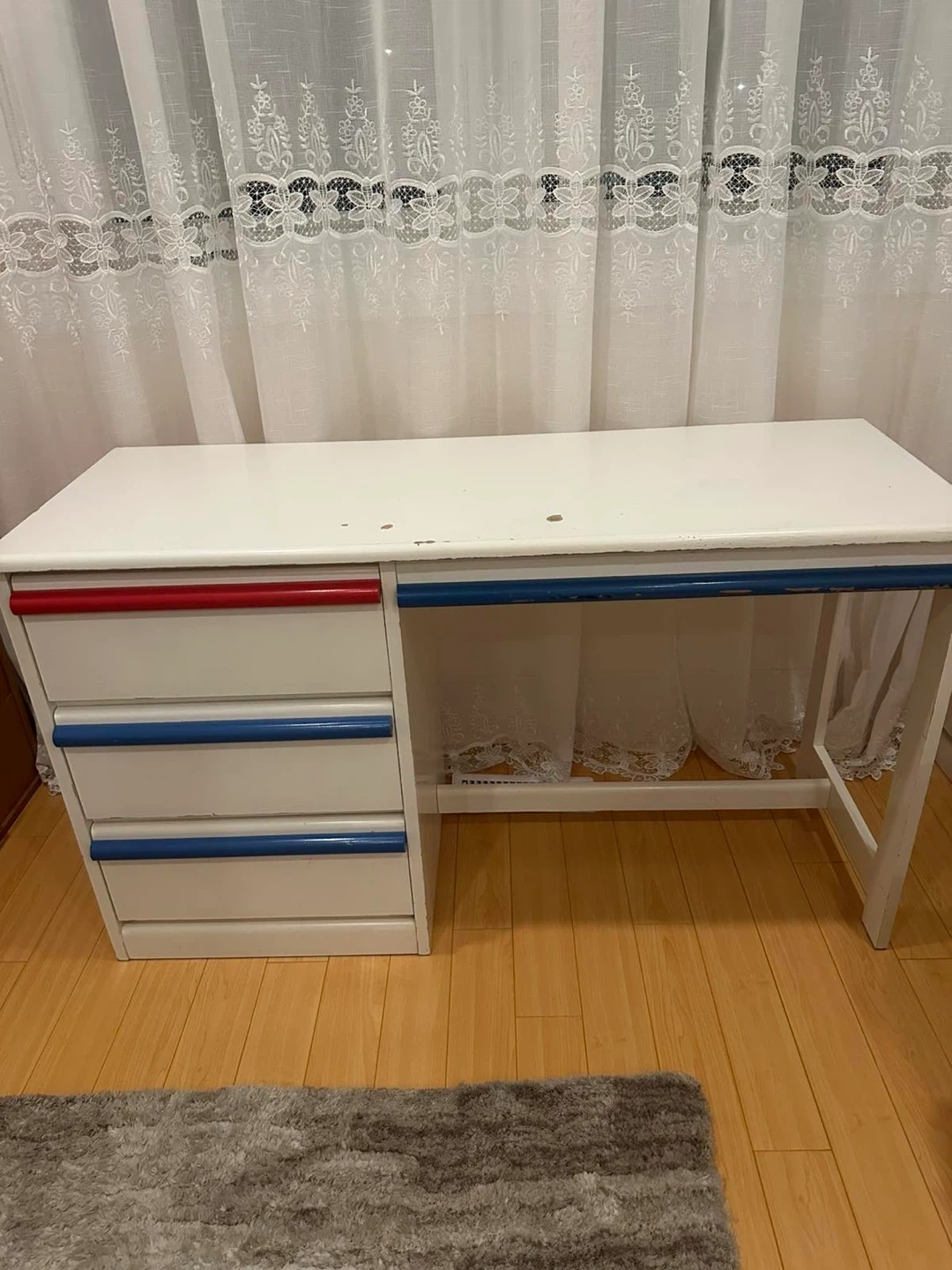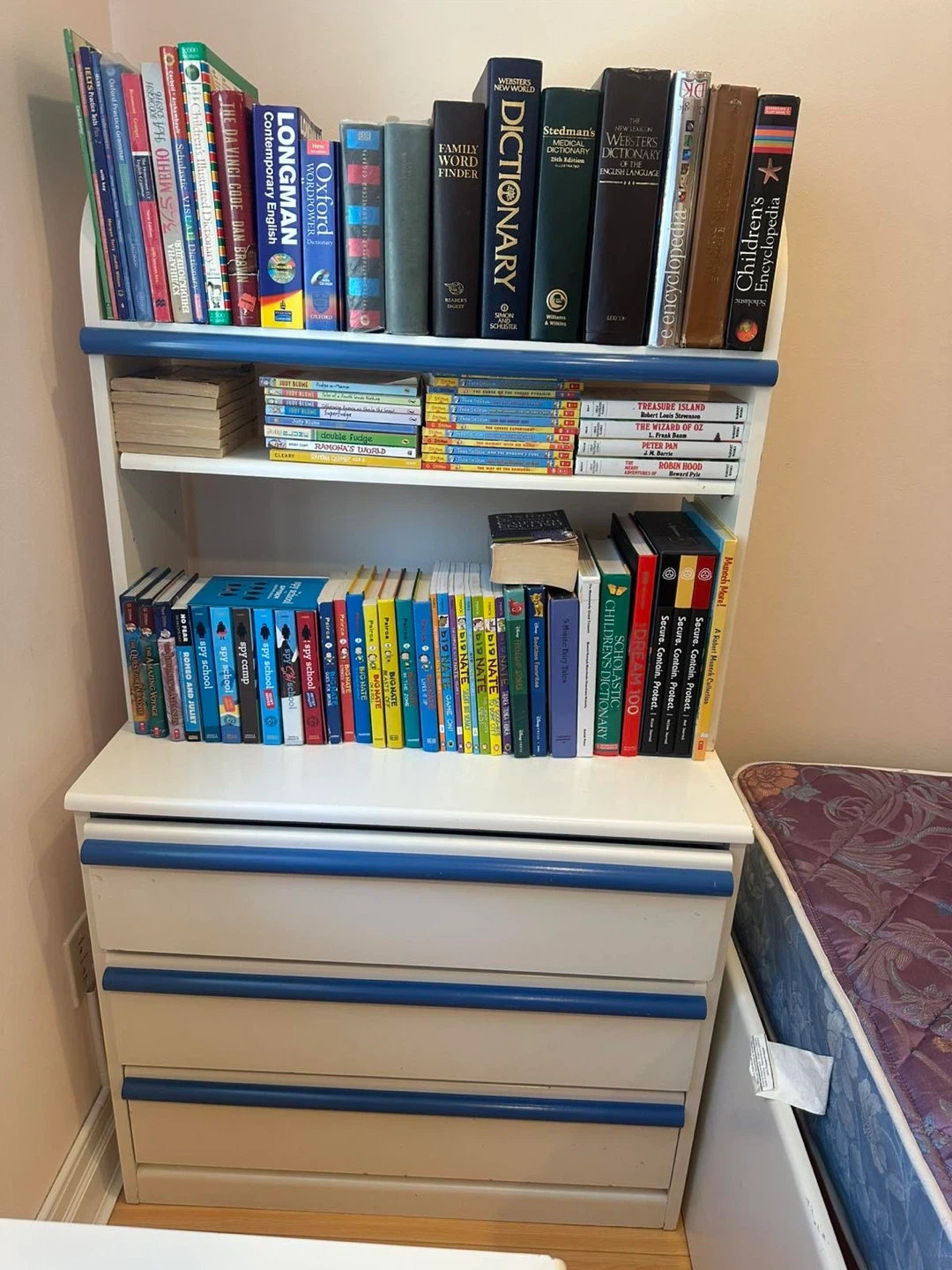 White single bed frame with a blue trim detail and matching nightstand. It comes with a patterned mattress and a particle board base. The nightstand features a drawer and an open shelf. Bookcase is in perfect condition.